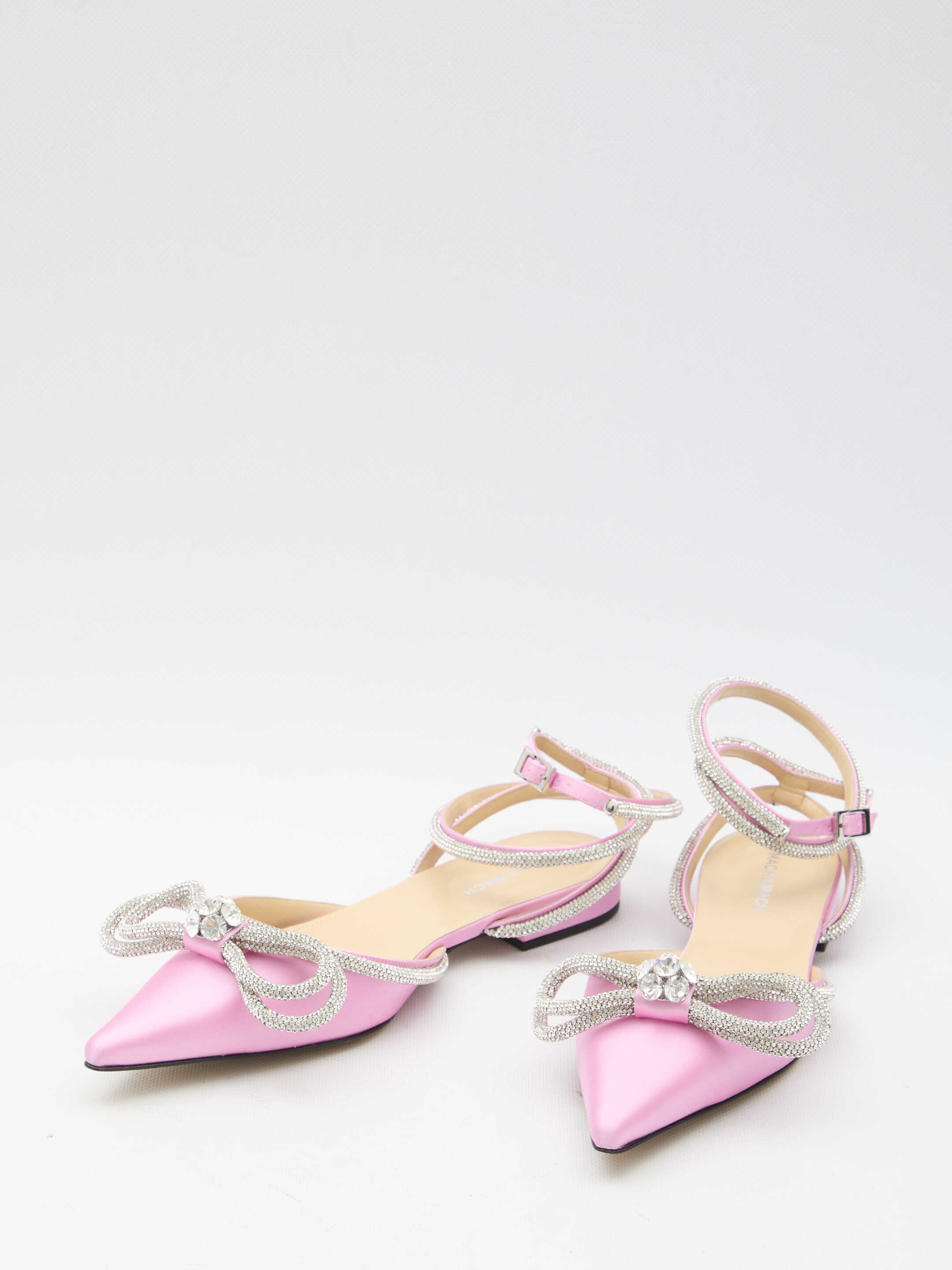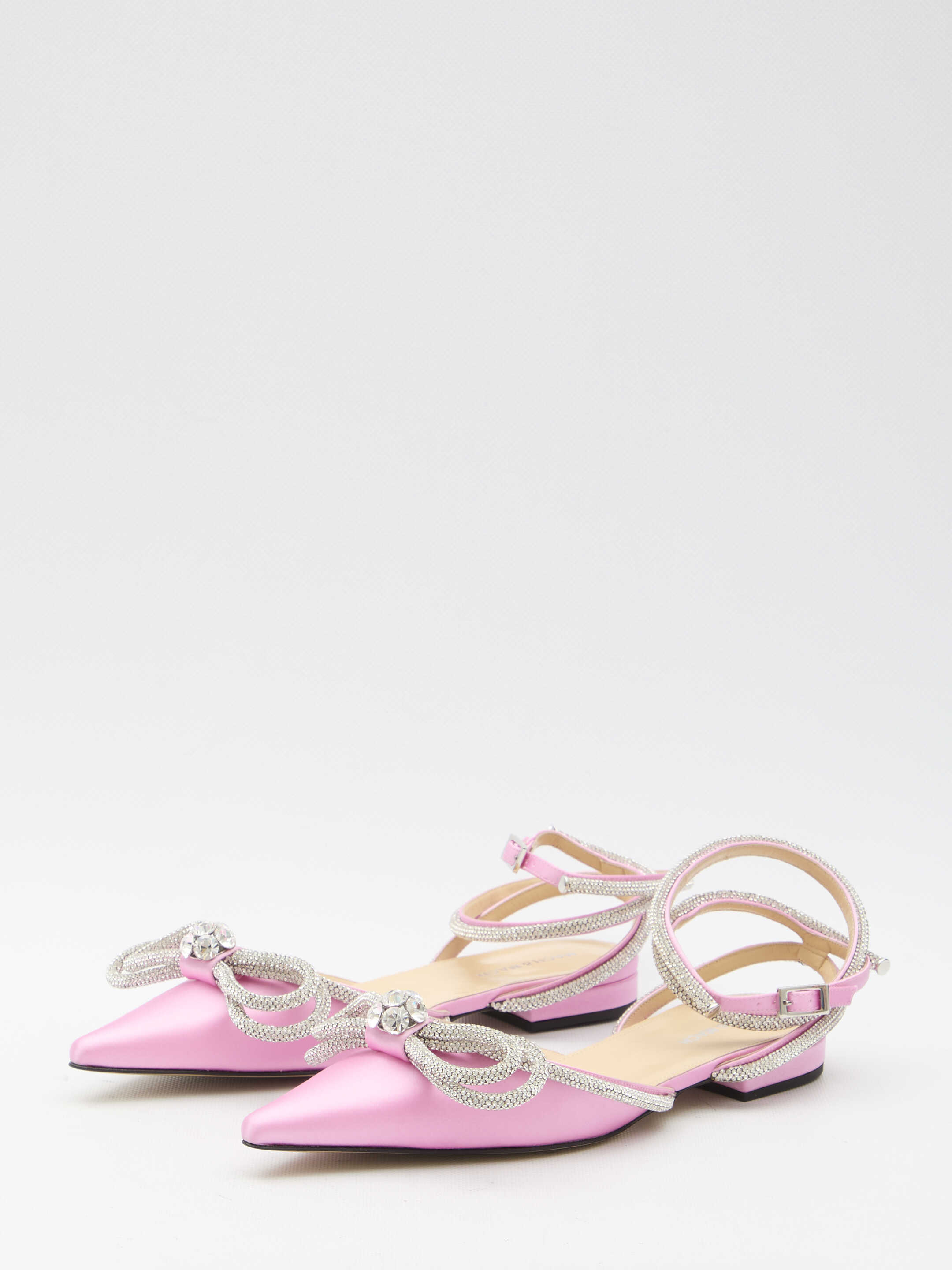 Double Bow ballerinas in pink satin with silver-tone crystal double bow. They feature pointed design, adjustable crystal ankle strap and leather sole.