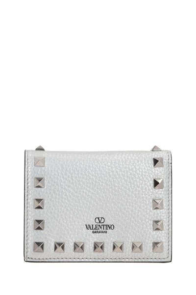 Valentino Garavani's flap wallet crafted in silver-tone grainy laminated leather adorned with signature silver-tone metal studs. Fabric / leather-lined interior with zip coin pocket, bill compartment, slip pocket and five card slots. The design is completed by the unmistakable embossed logo at back.