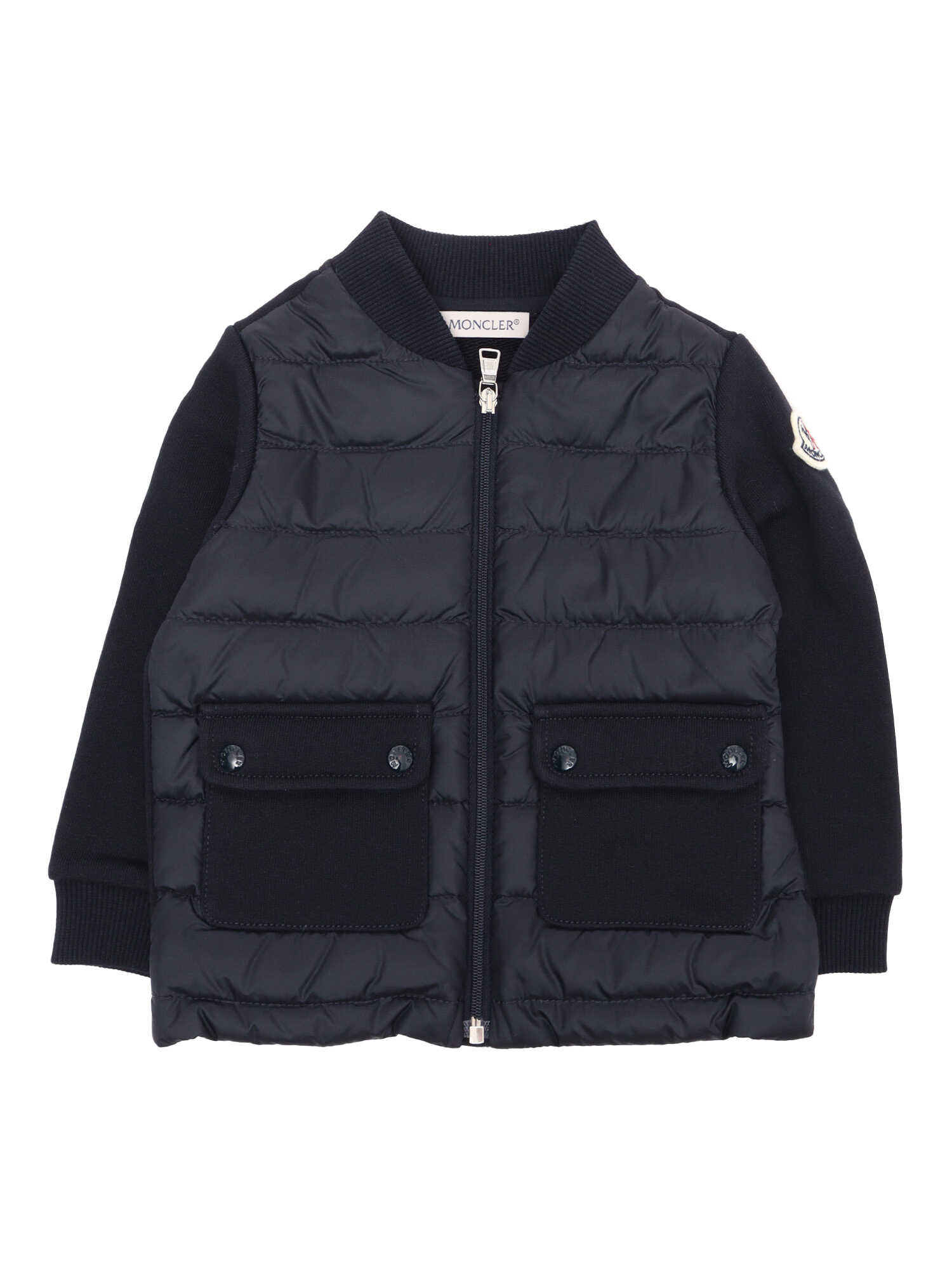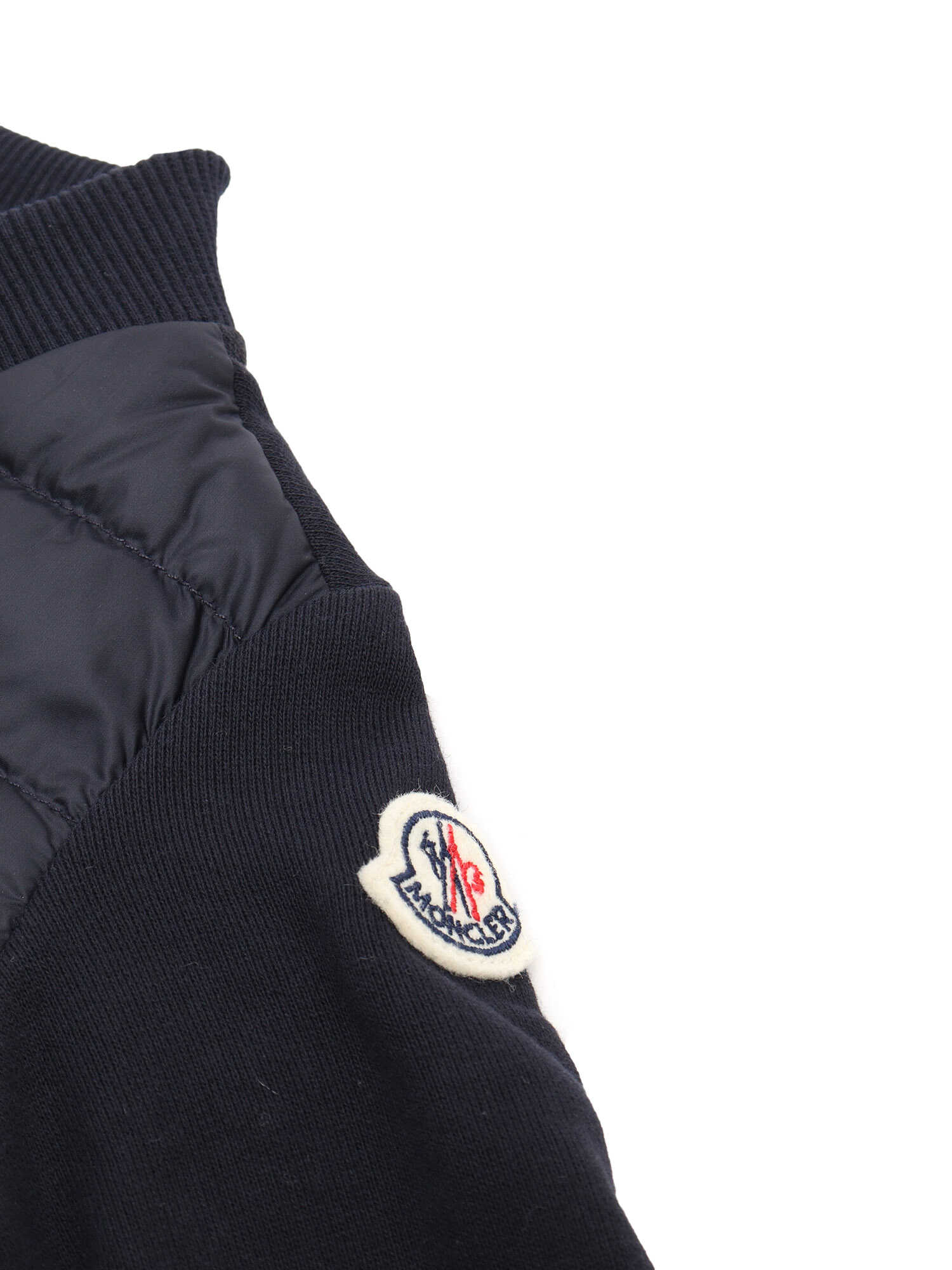 Moncler padded sweatshirt with front padding, zip closure, maxi pockets with flap and clip buttons, Moncler logo plate on the shoulder.