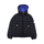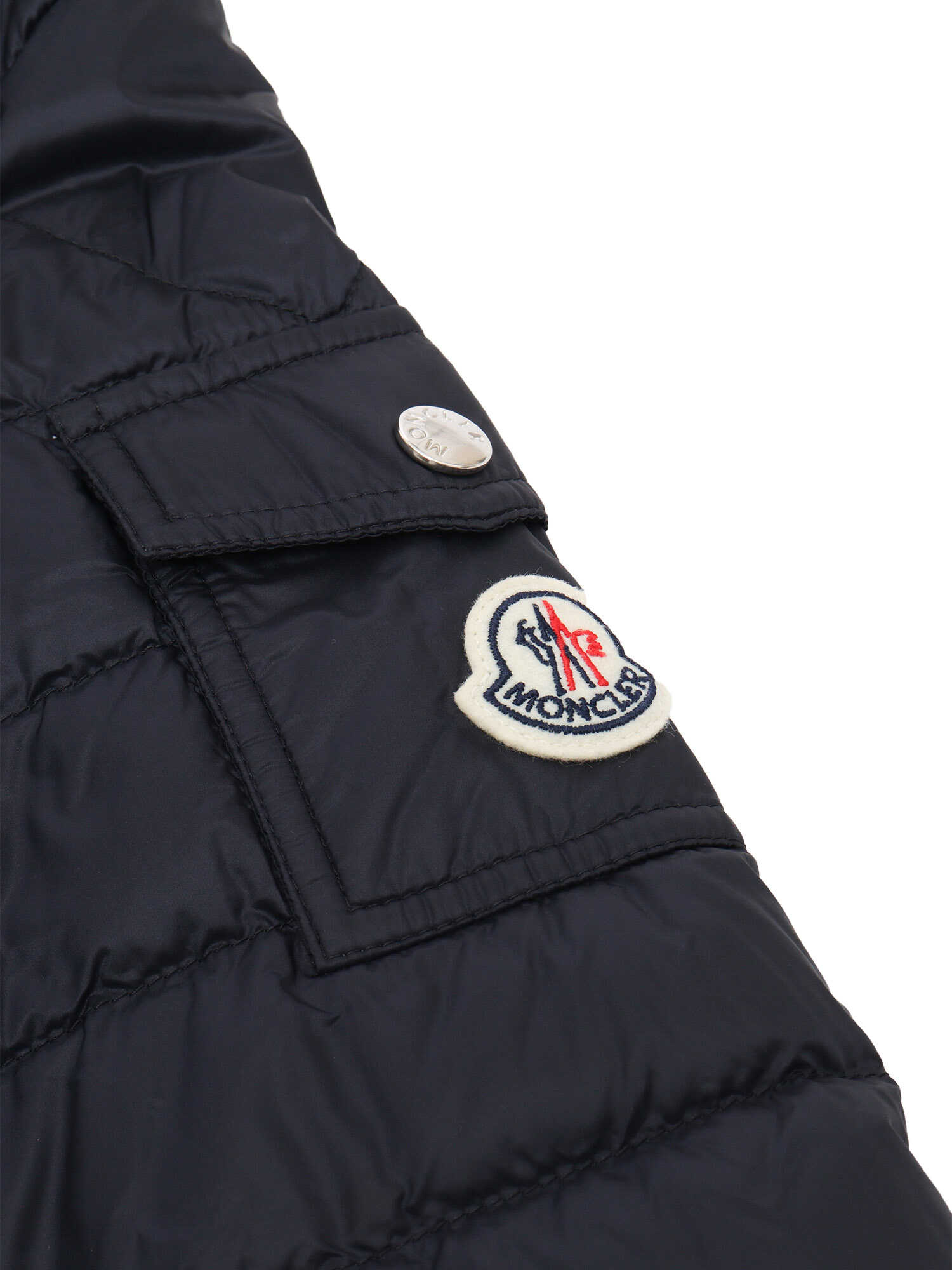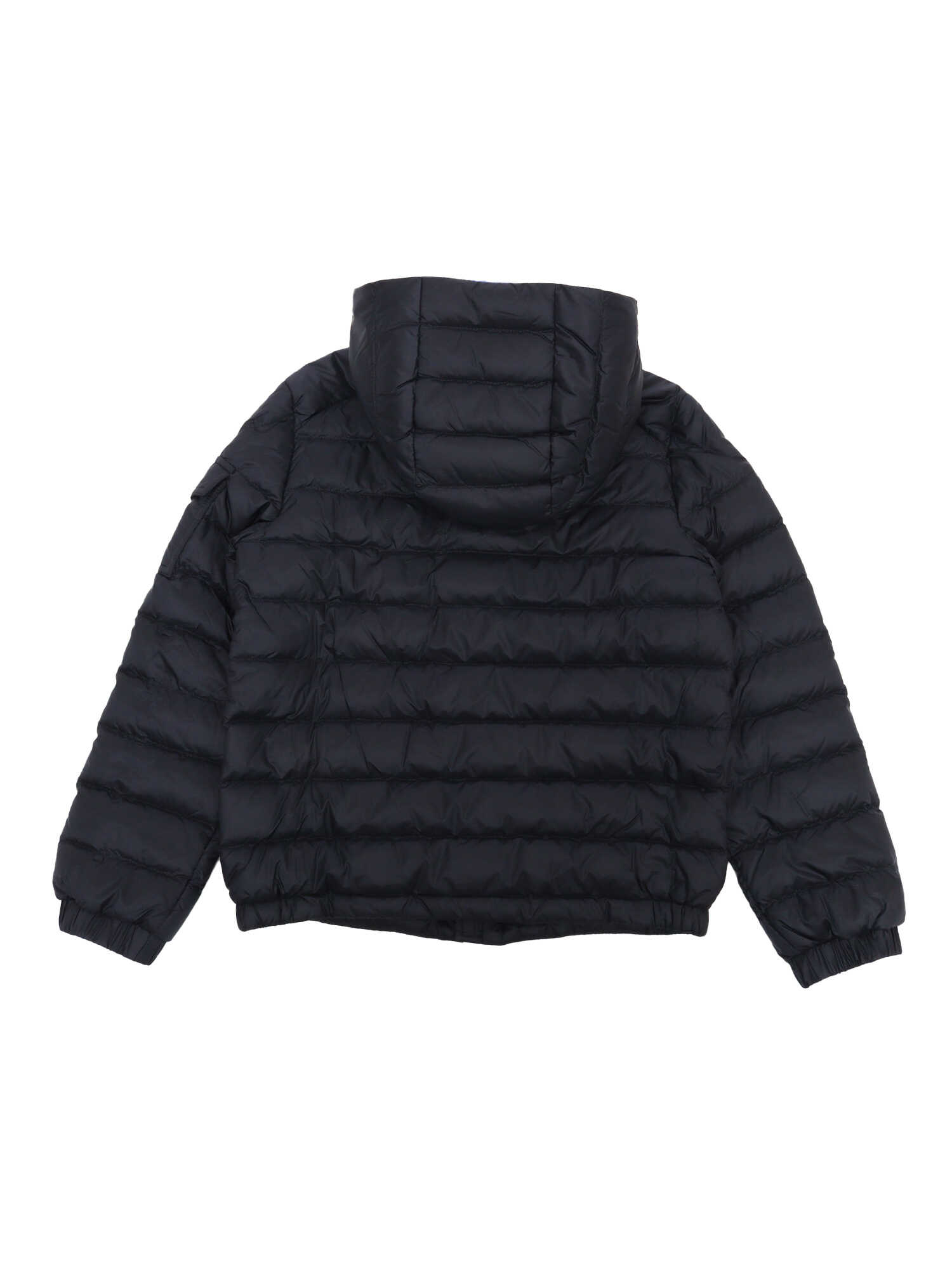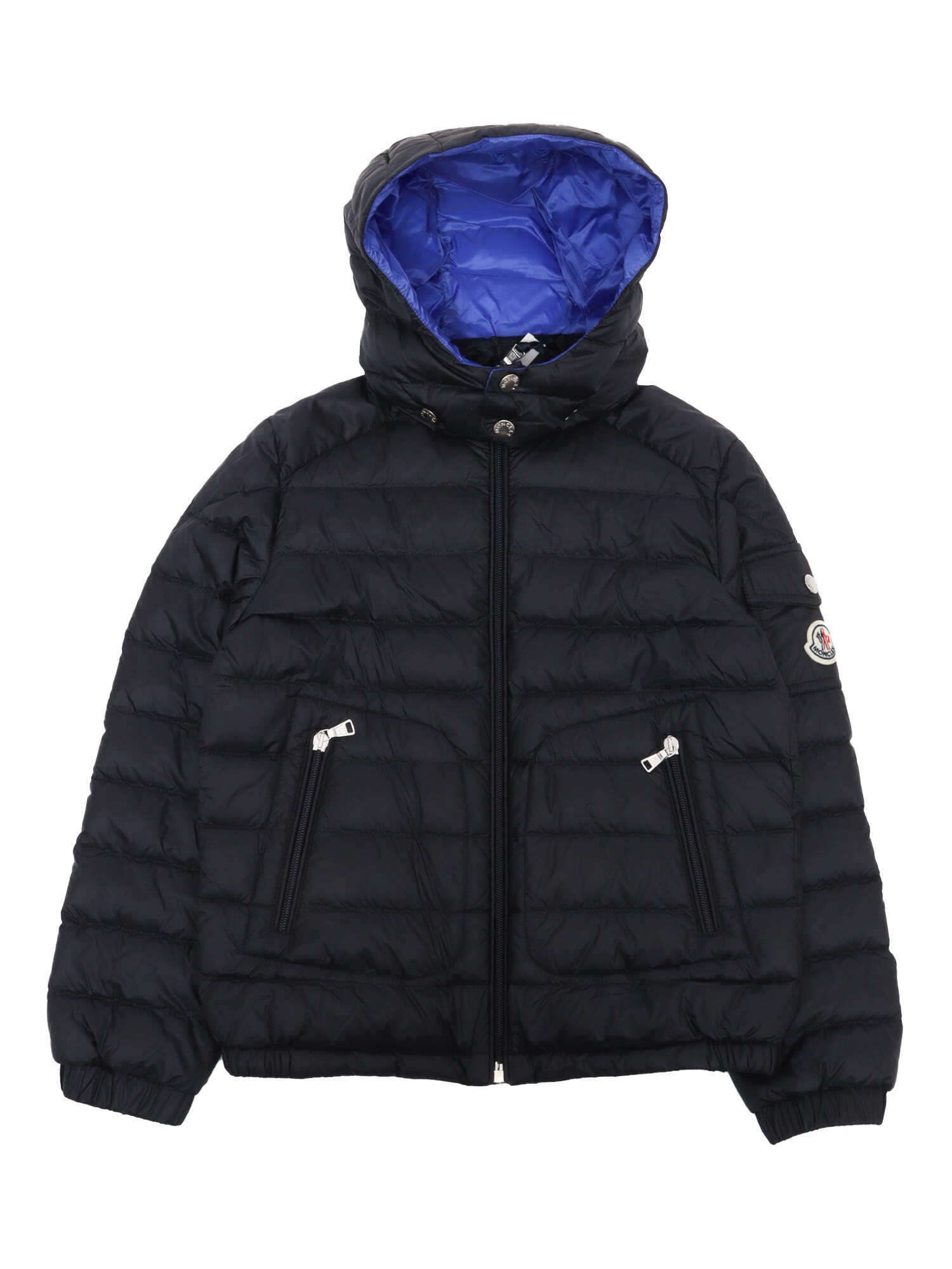 Lauros hooded down jacket for children, contrasting internal fabric. Includes two slanted front pockets with zip, one small pocket with flap and clip button on the shoulder, applied Moncler logo plate.