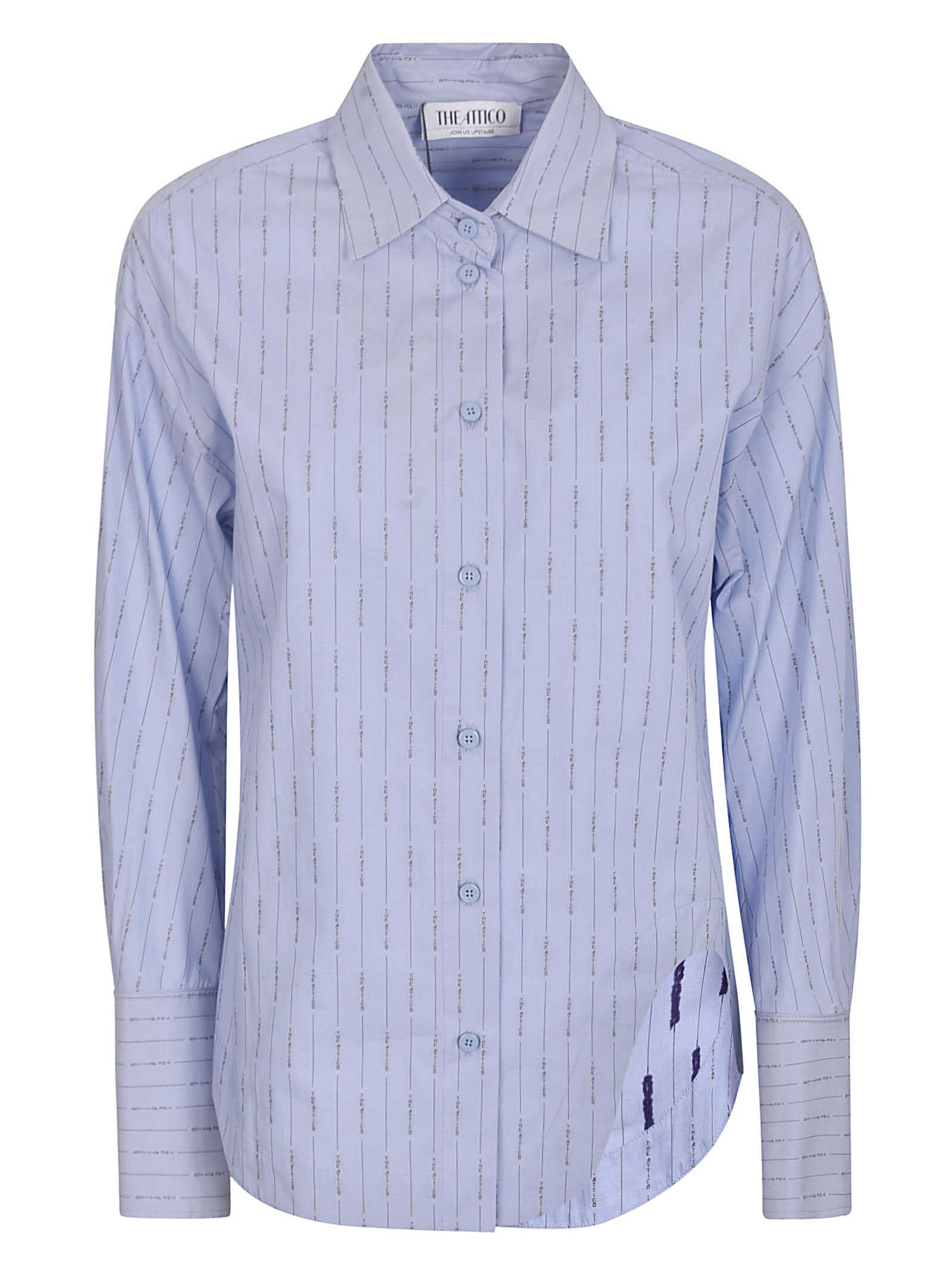 light blue cotton poplin texture stripe pattern all-over logo embroidery classic collar long sleeves with buttoned cuffs cut-out detailing straight hem