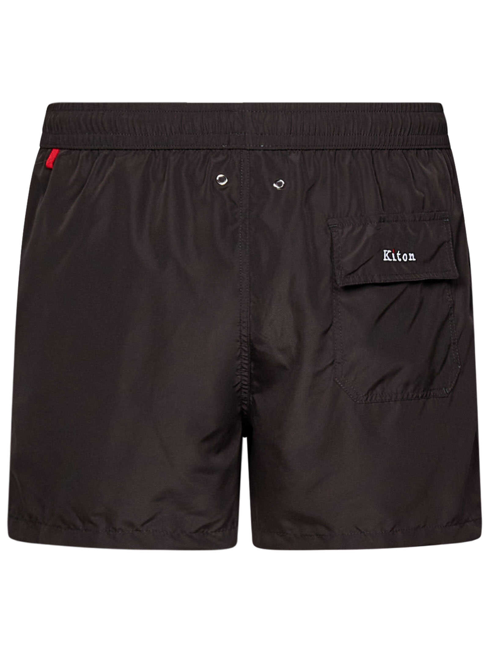Brown lightweight polyester swim shorts with logo embroidered at back.
