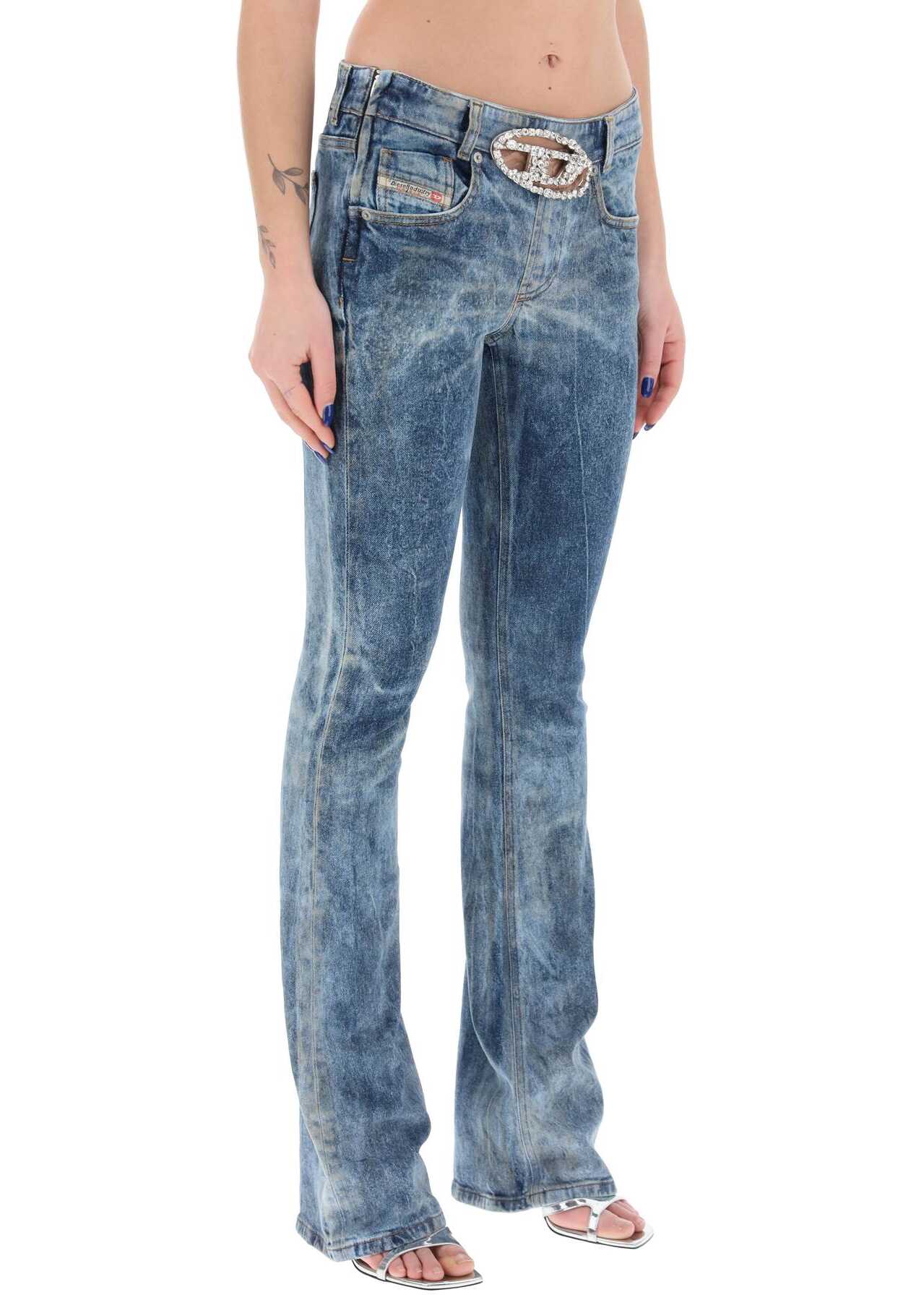 Diesel five-pocket bootcut jeans made of dirty wash stretch cotton-hemp denim. Cut in a low rise, they boast a crystal-embellished "Oval D" logo buckle with cut-out details inlaid at front waist. Side zip fastening, signature logo label on the coin pocket. Slim fit. The model is 177 cm tall and wears a size 26.