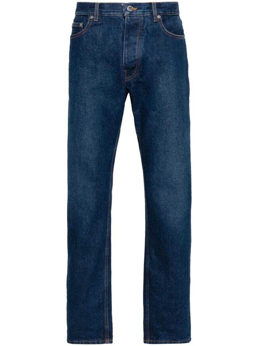 blue cotton denim contrast stitching logo-engraved silver-tone hardware logo patch to the rear low-rise straight leg belt loops concealed fly and button fastening classic five pockets