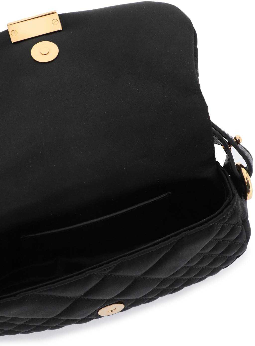 Greca Goddess mini shoulder bag by Versace in quilted satin, enriched with metal Greca detail encrusted with crystals on the flap with magnetic closure. Lined interior with a leather card slot. Top removable and adjustbale handle, for a hand or shoulder look, characterized by Greca buckle. Gold-finished metalware.