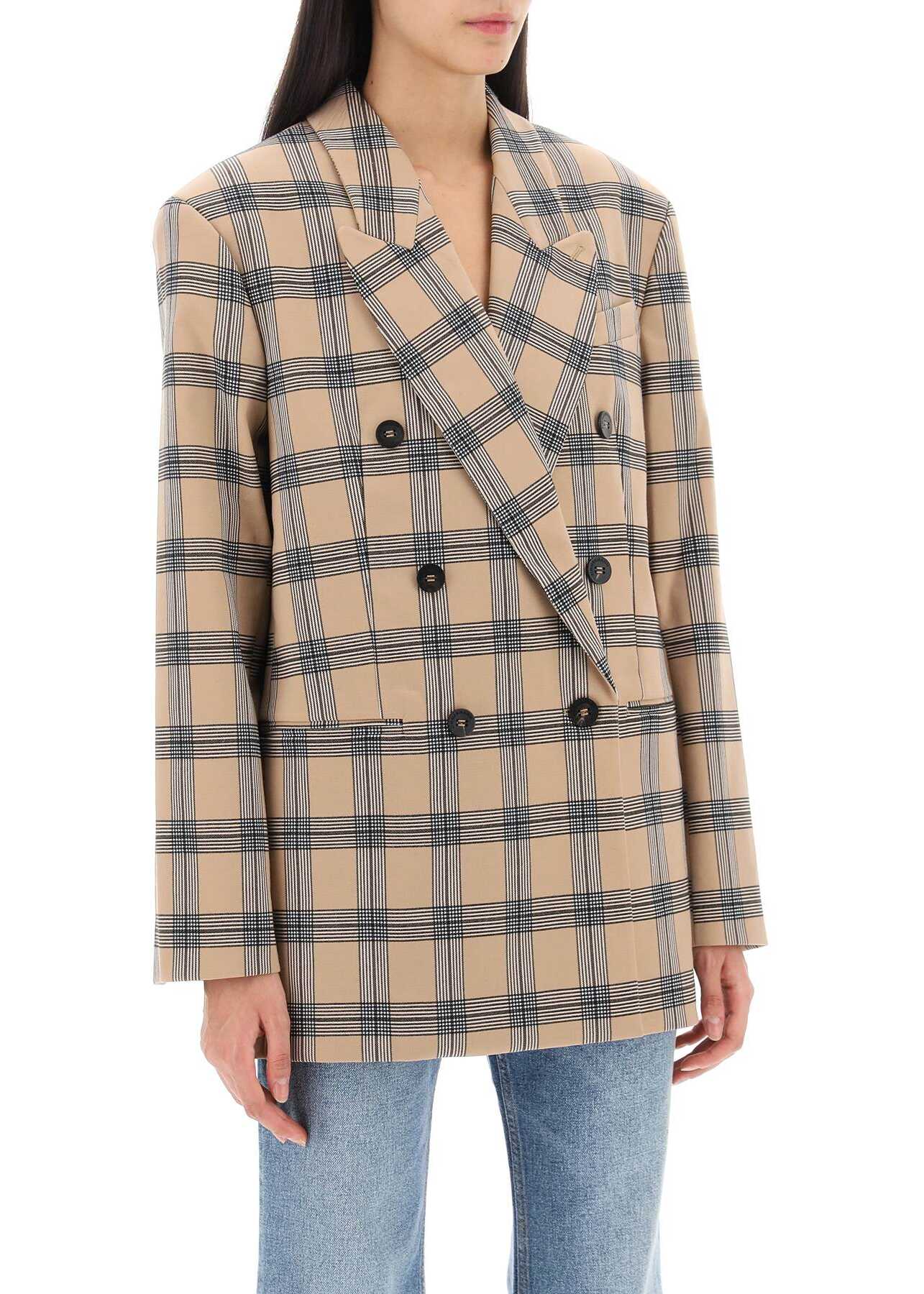 Deconstructed jacket by Zimmermann crafted in wool-blend cavalry, with check motif all-over and double-breasted design with six-button closure. It features peak lapel, welt pockets, buttoned cuffs and back-center vent. Lined in logo jacquard fabric on the inside. Oversized fit with slightly padded shoulders. The model is 177 cm tall and wears size 1 Zimmermann.