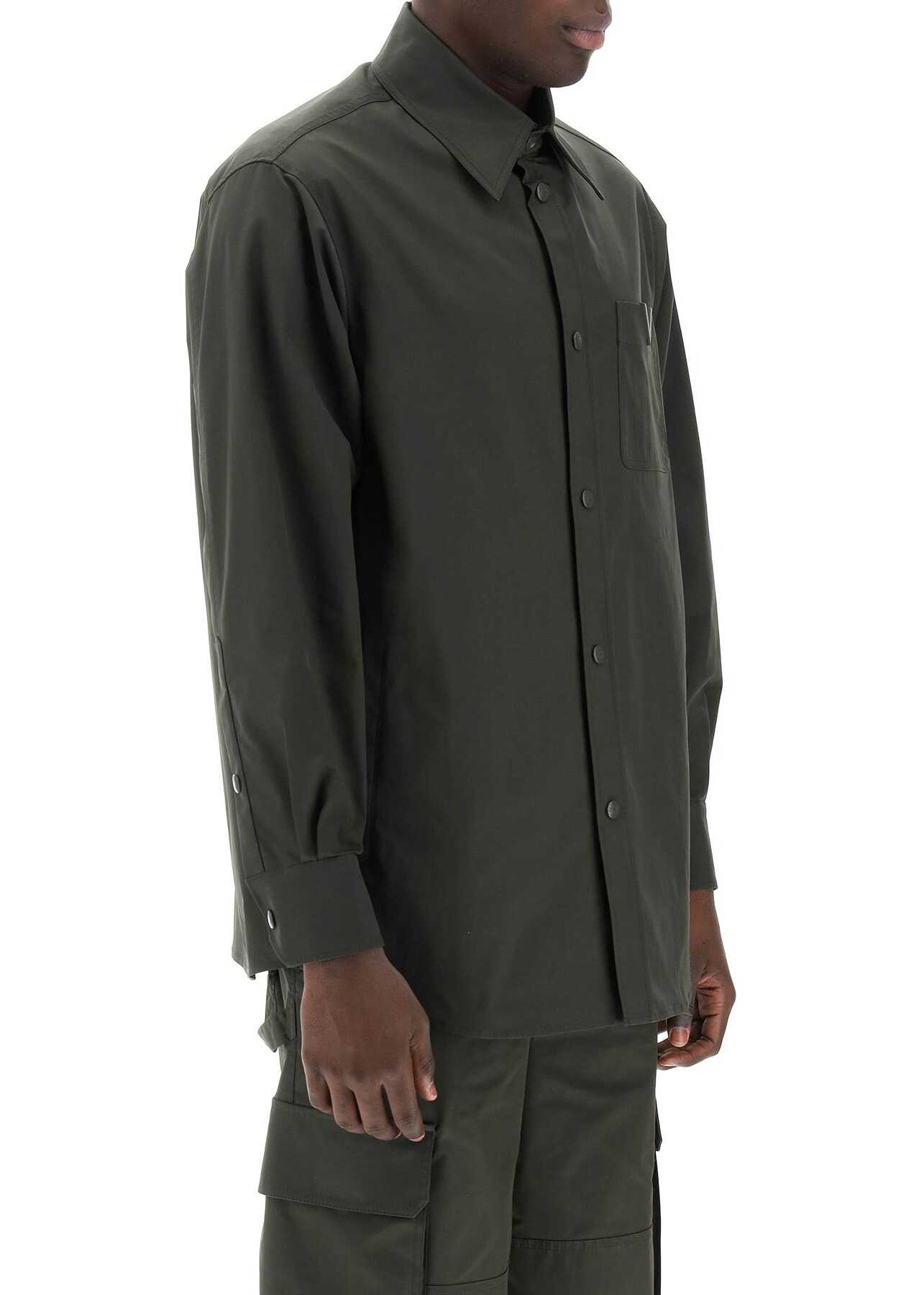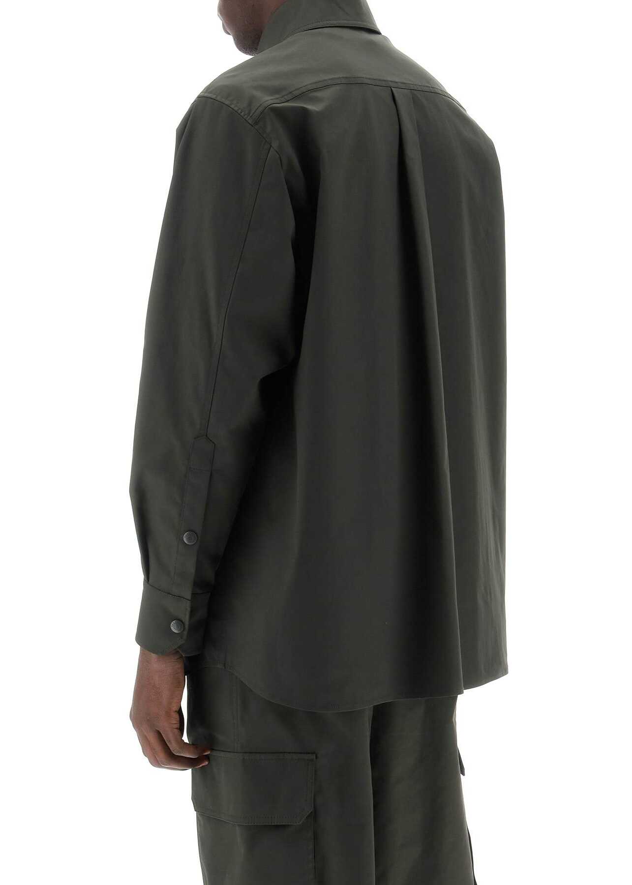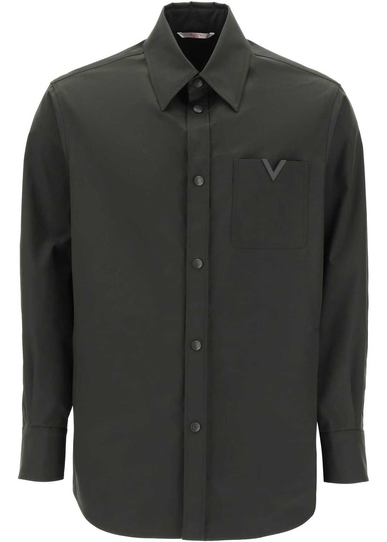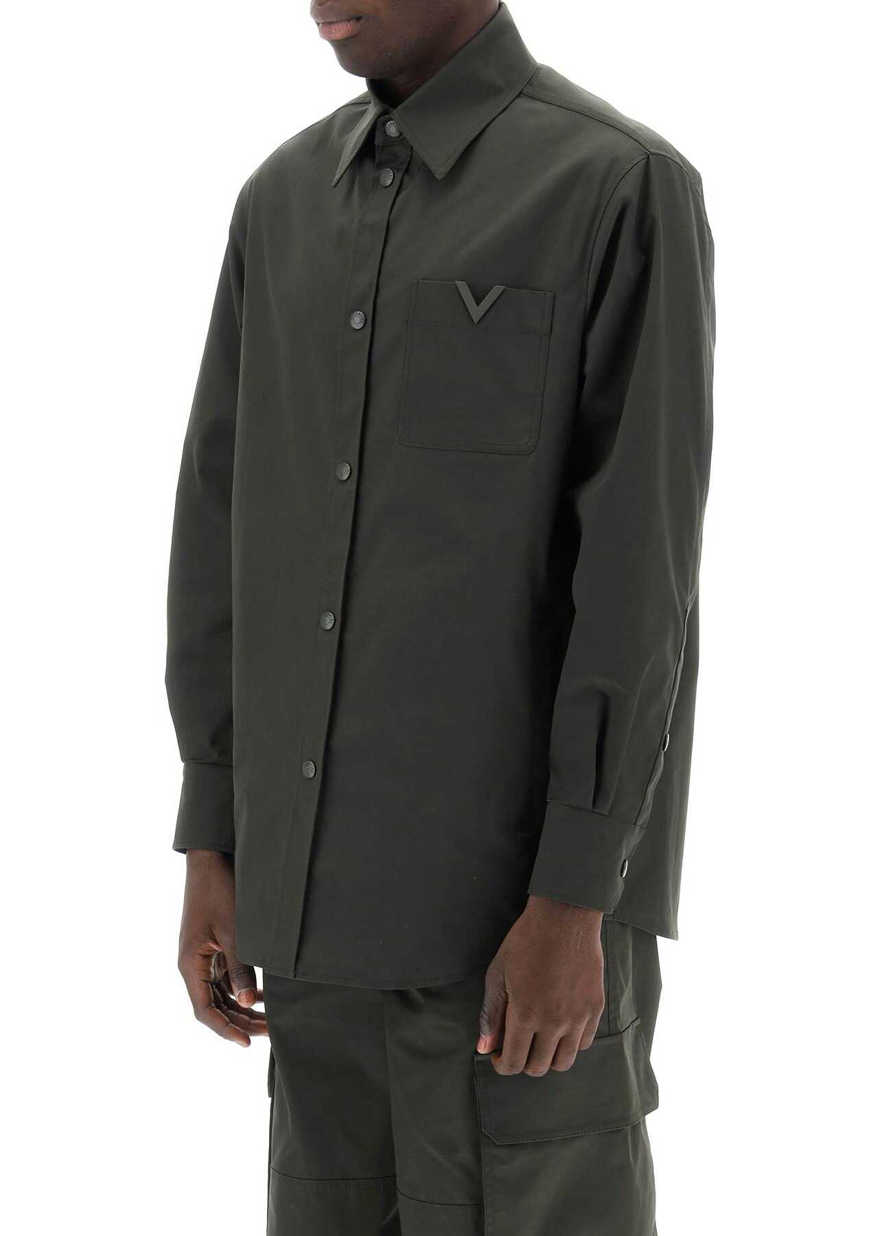 Valentino snap-up overshirt cut from stretch nylon twill to a loose fit. It comes with a classic point collar, side welt pockets, and a chest patch pocket with tonal V Gold appliqué. The model is 187 cm tall and wears a size IT 48.