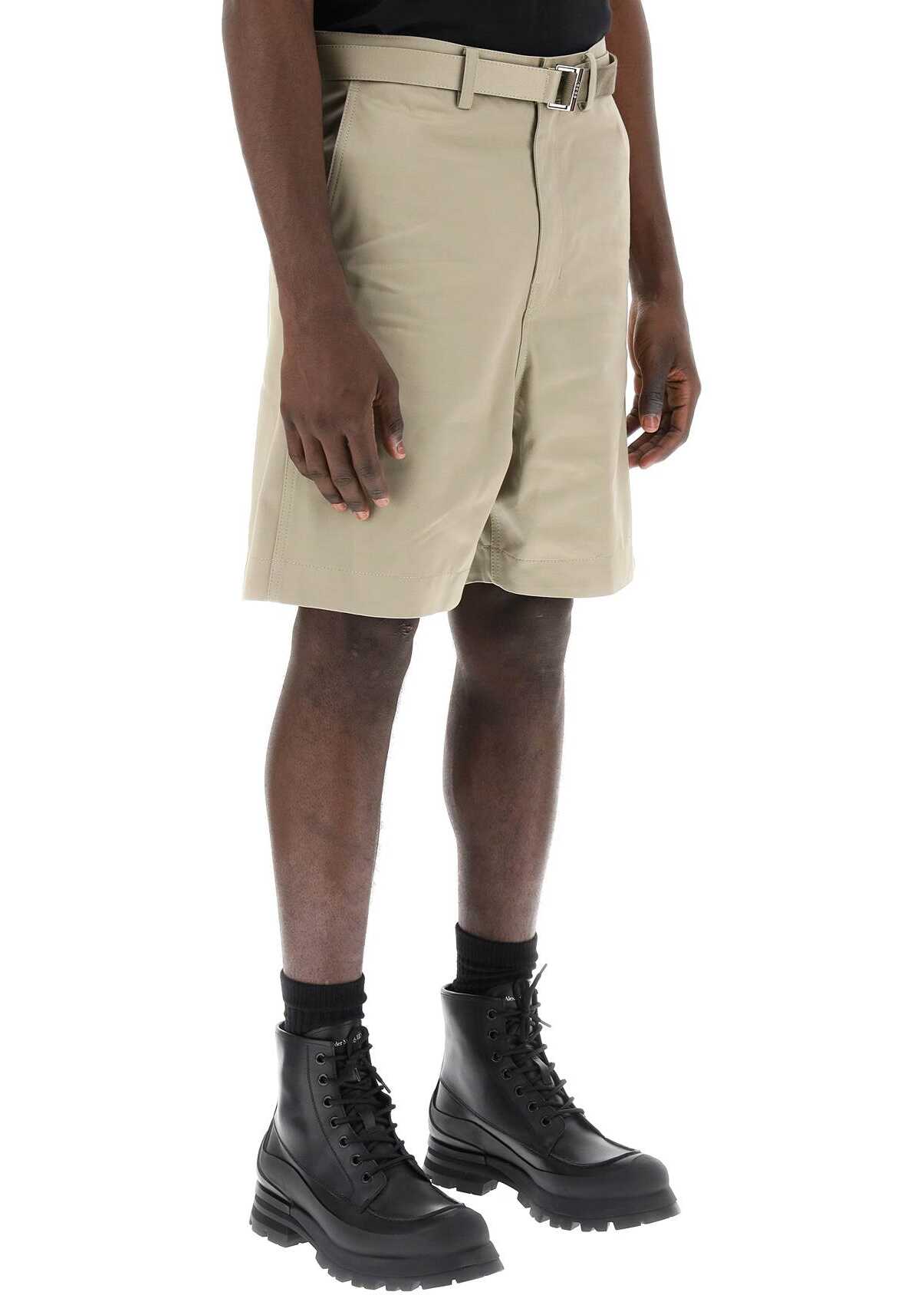 Sacai shorts crafted in pure cotton gabardine, characterized by removable belt with sliding buckle at the waist. They feature zipper-fly and button closure, side slash pockets and back welt pockets with buttons. Loose slightly flared cut. The model is 187 cm tall and wears size 3 Sacai.
