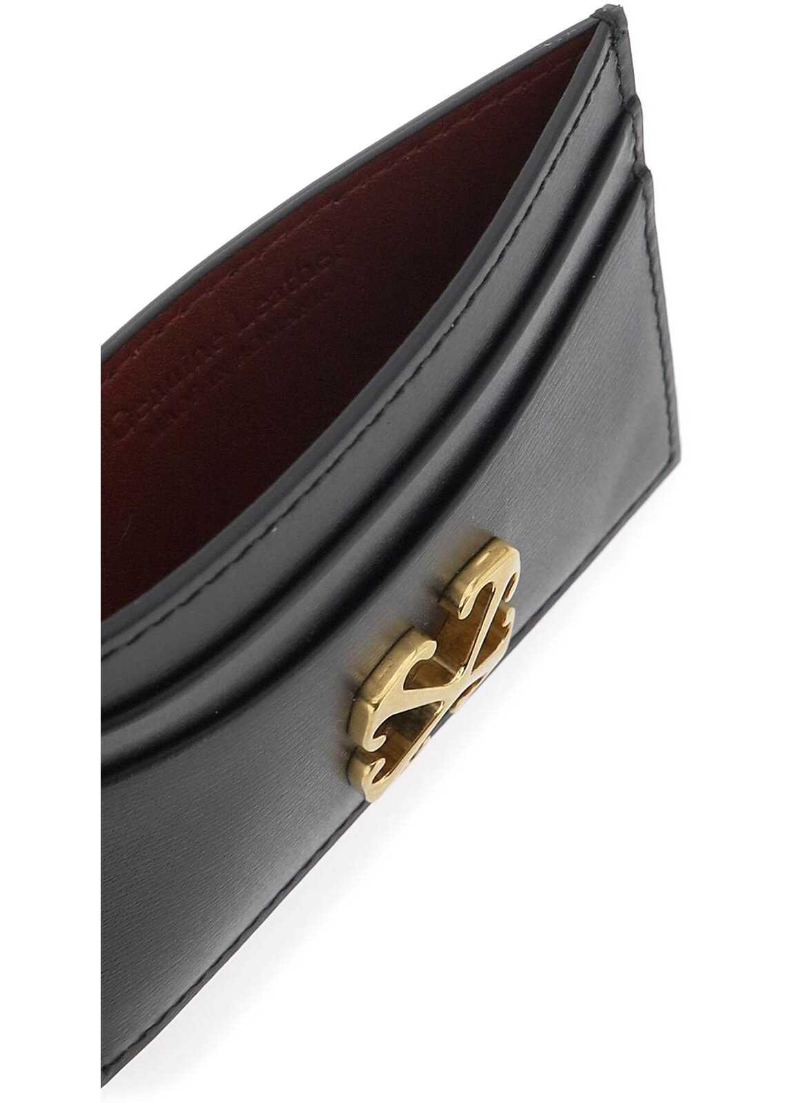 Jitney card holder by Off-White in boarded leather with iconic gold-finished metal Arrows at front. It features four credit card slots and a central slit pocket.