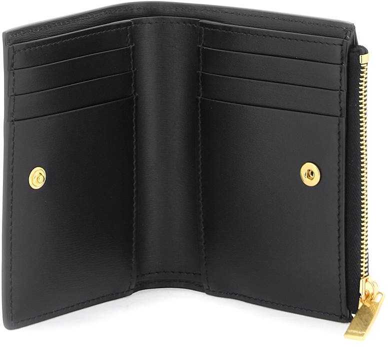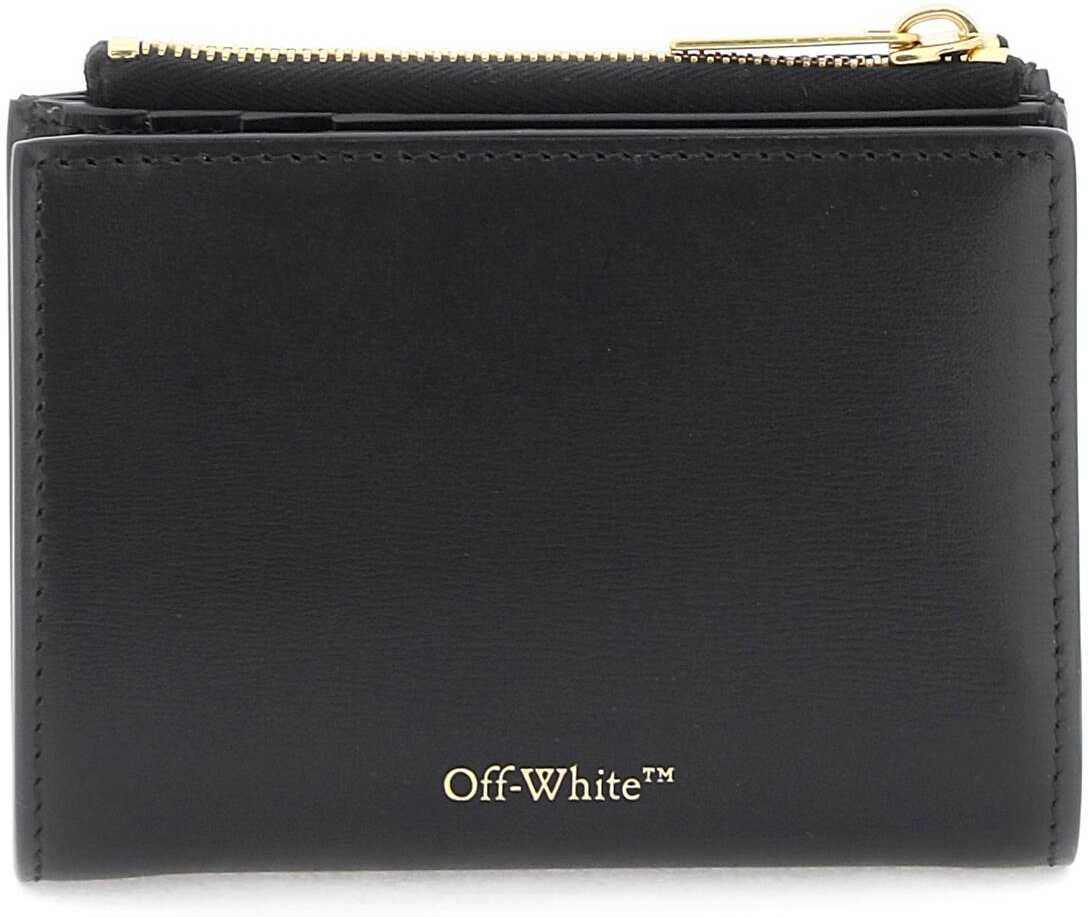 Jitney bi-fold wallet by Off-White made of boarded leather with iconic metal Arrows at front. Snap-button closure, leather interior featuring one bill pocket, six credit card slots and two slit pockets, additional zippered coin pocket. Gold-finished metalware.