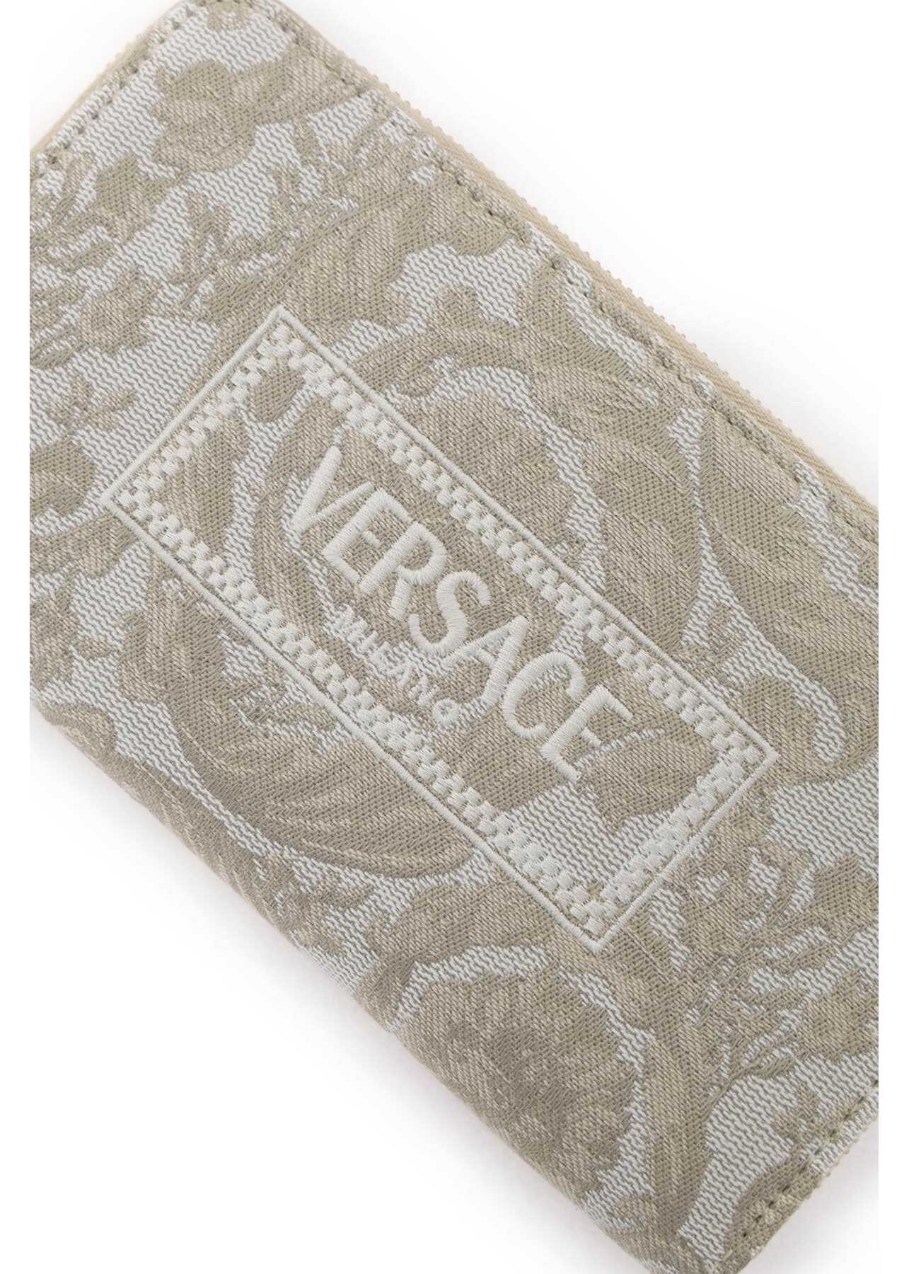Versace long wallet made of jacquard canvas featuring all-over Barocco motif and embroidered 90's Vintage Logo at front. Zip-around closure, leather interior with two bill compartments, twelve credit card slots and one zippered coin pocket. Gold-finished metalware.