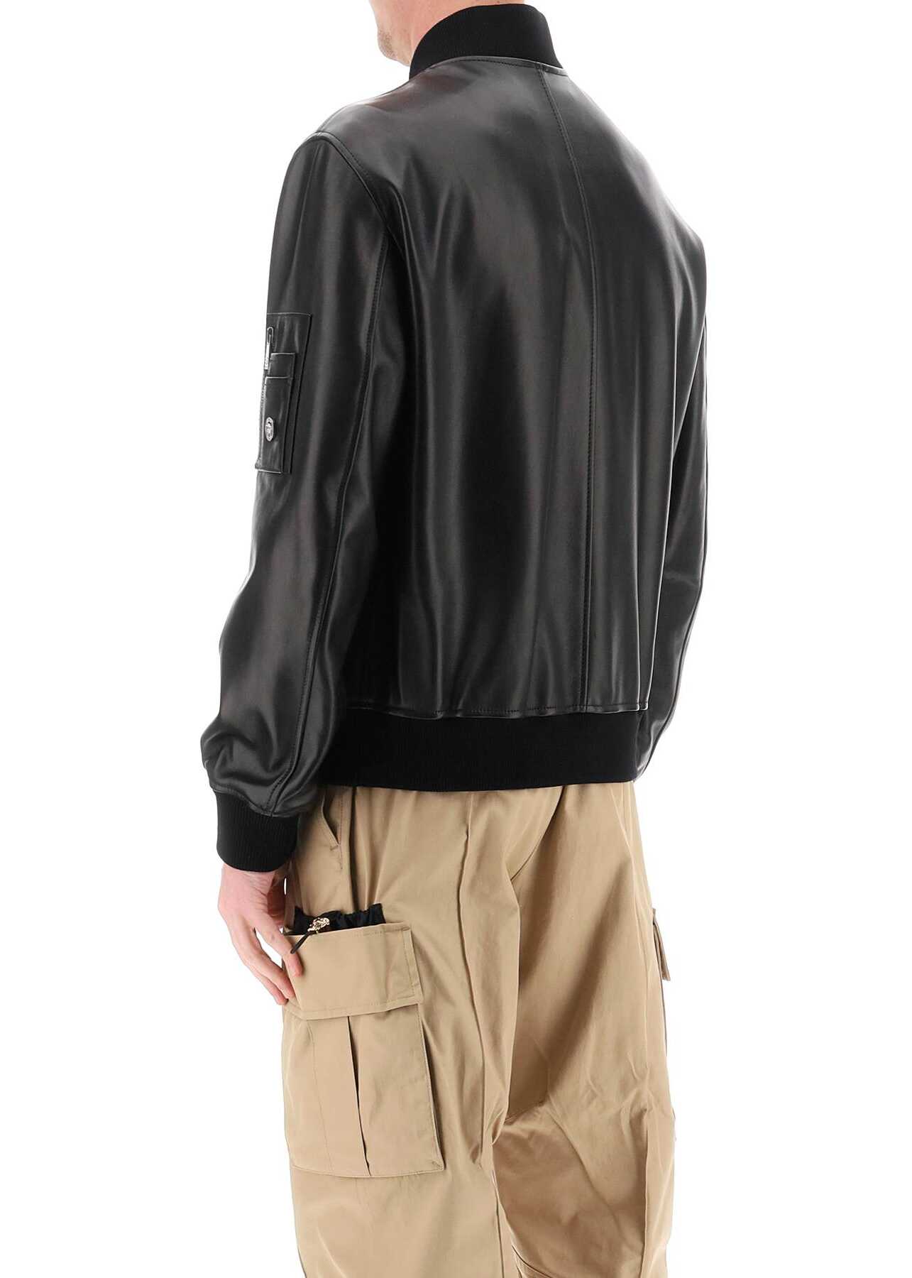 Versace bomber jacket crafted in smooth lamb leather, adorned with silver-tone metal Medusa detailing. It features crew neck, cuffs and hem in ribbed knit, zipped closure and pockets, and it is enriched by an utility pocket on the left sleeve. Branded with tonal logo embroidery on the chest. Lined in jacquard Barocco cotton and provided with pockets on the inside. Regular fit. The model is 187 cm tall and wears size IT 48.