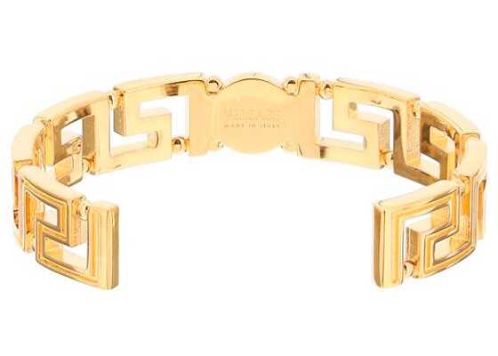 Gold metal bracelet by Versace with all-over Greca motif and Medusa in the center. The item in photo is size M.