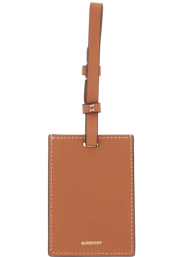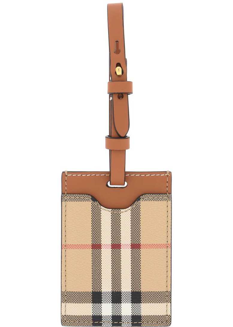 Burberry luggage tag crafted in faux leather with calf leather interior and Burberry Check insert. It features adjustable stap and a card slot. Gold-tone finish metalware.