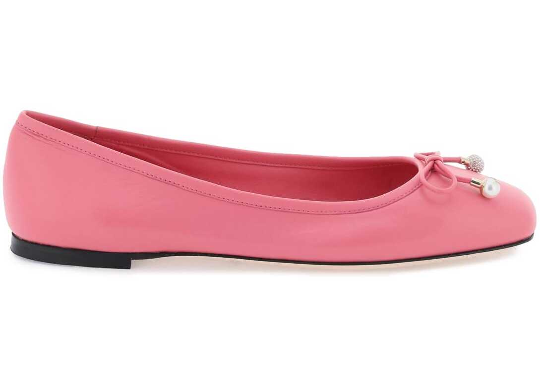 Jimmy Choo "Elme" ballerina flats crafted in nappa leather and featuring a bow on the toe decorated with crystal-embellished pearls and JC logo. Leather footbed and leather sole.