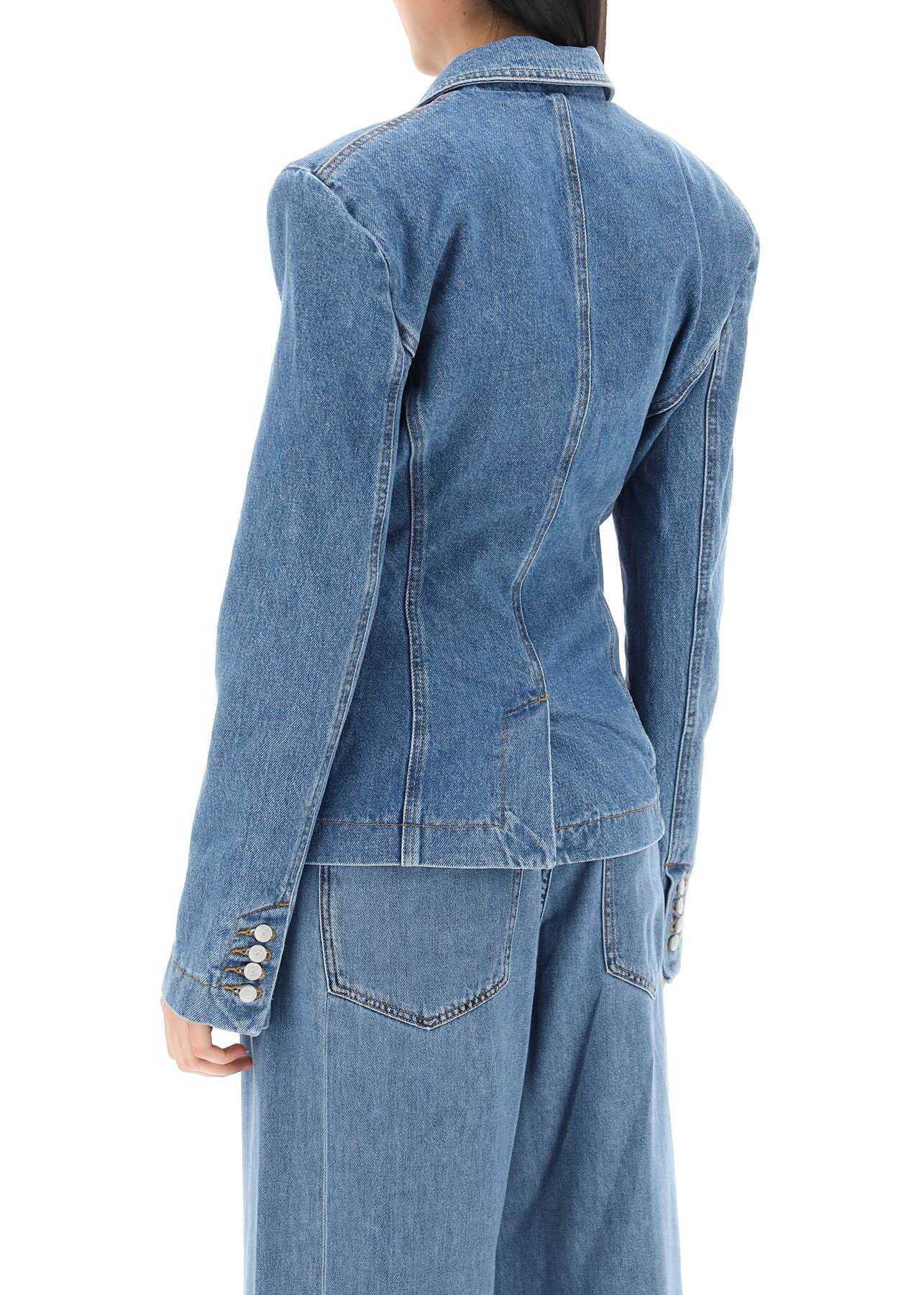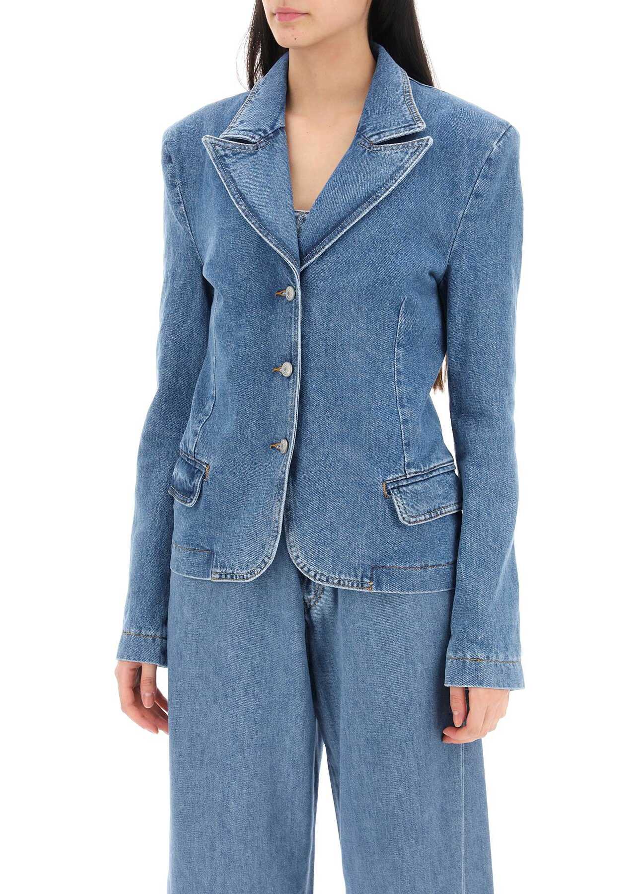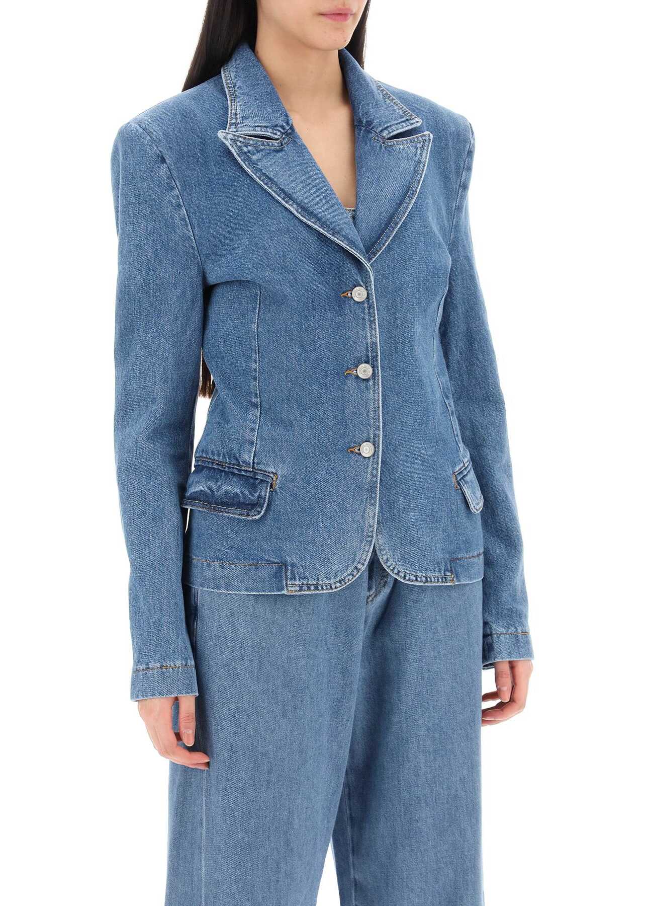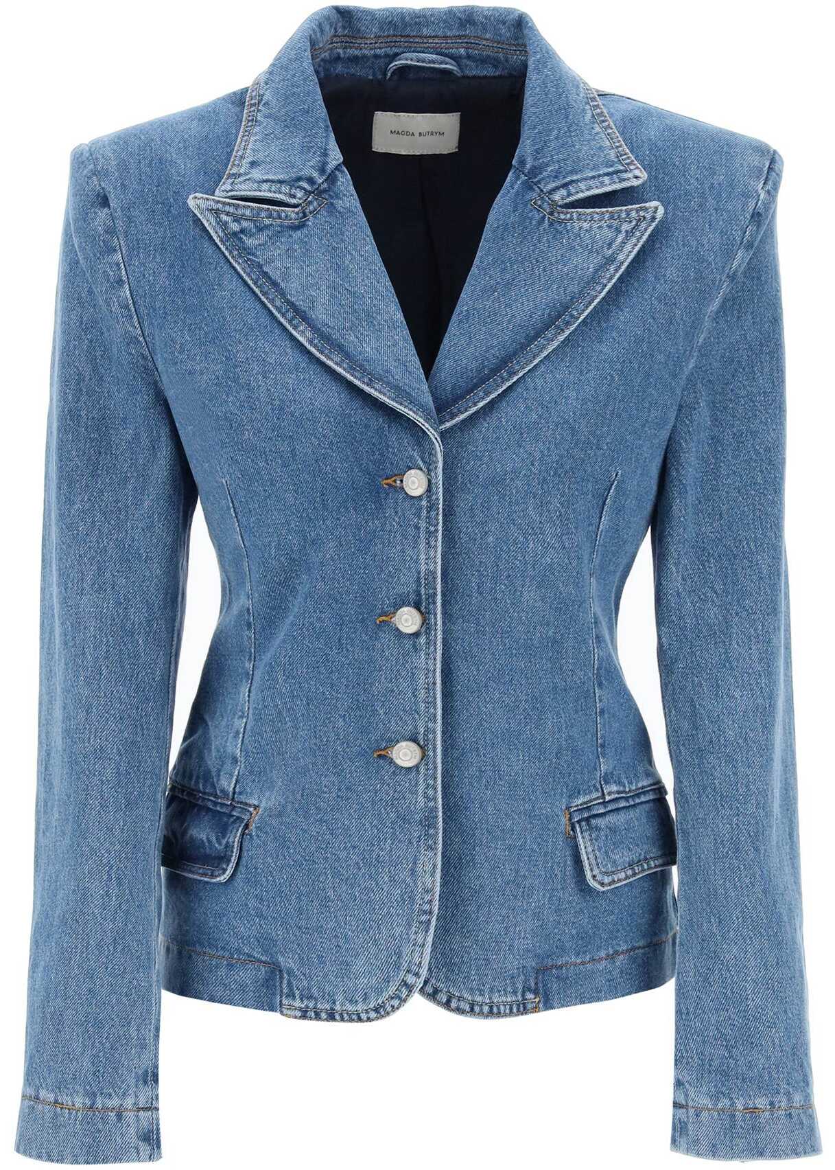 Magda Butrym jacket made from pure cotton denim with single-breasted design and three logo-button closure. It features peak lapel, buttoned cuffs and back-center vent. Lined in silk. Shaped cut with padded shoulders. The model is 177 cm tall and wears size FR 36.