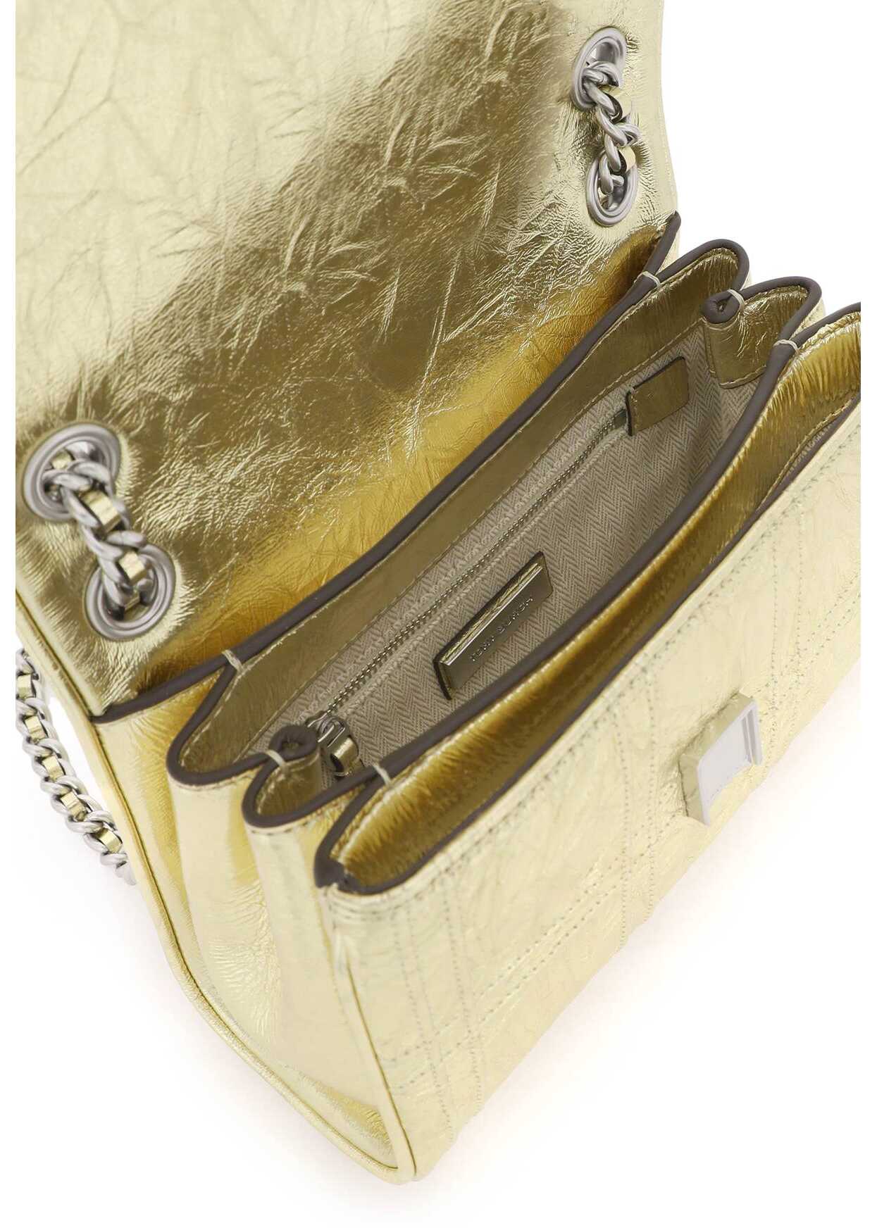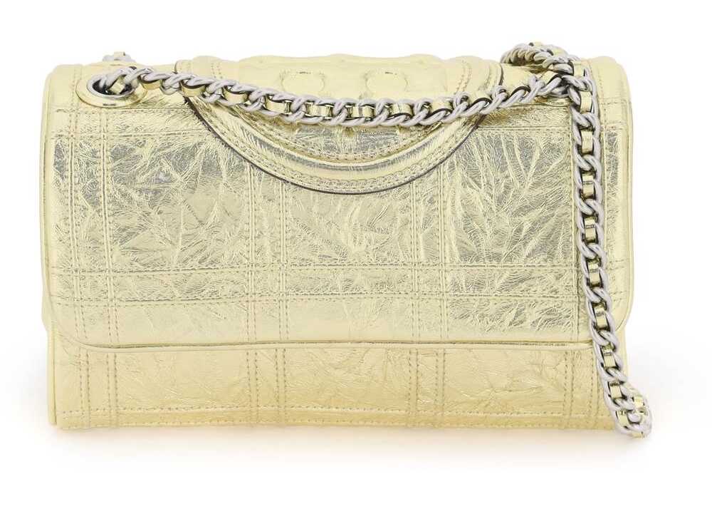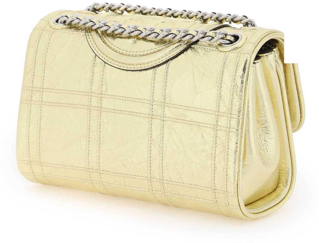 Small Fleming bag by Tory Burch in laminated nappa with embossed quilting and embossed maxi Double T logo on the top. Sliding leather-woven chain strap to carry on the shoulder or crossbody. Flap with magnetic button closure and fabric-lined interior with a slit pocket, a gusset compartment with a zippered flat pocket and a front pocket with a flat patch pocket. Silver-finished metalware.