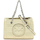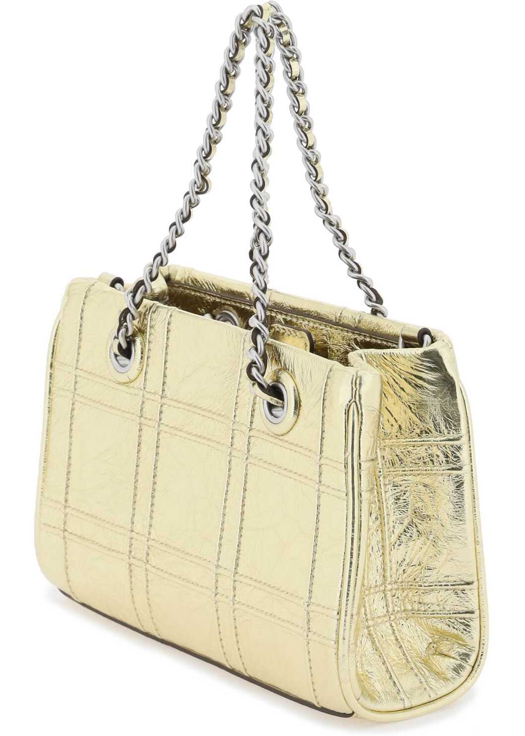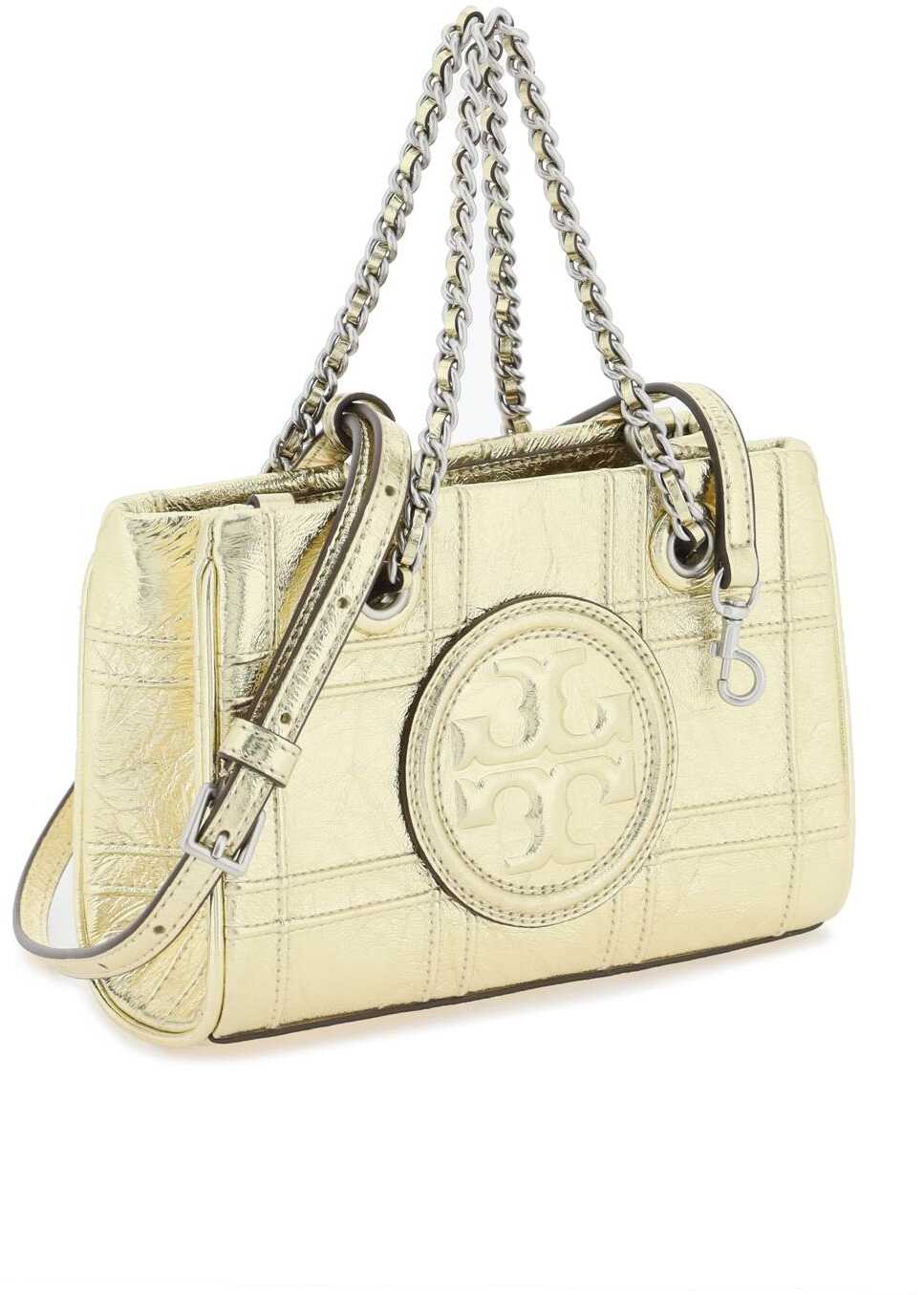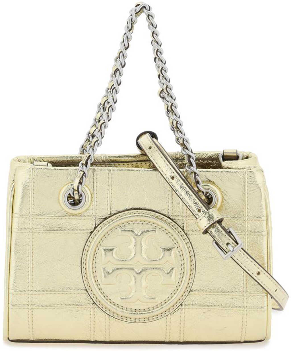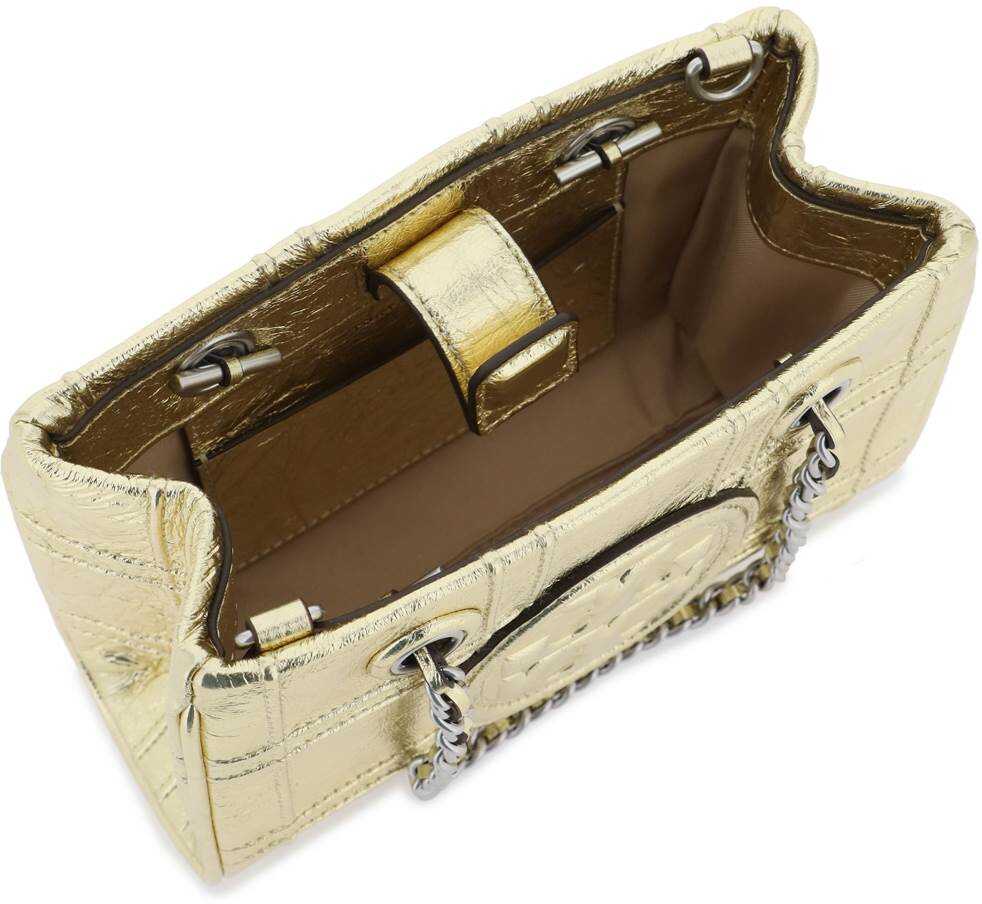 Tory Burch mini Fleming bag made of laminated leather with pintucks in a diamond pattern and oversize bombé Double T. Chain handles with woven leather, magnetic closure. fabric interior with one card slot and adjustable, detachable shoulder strap. Gold-finished metalware.
