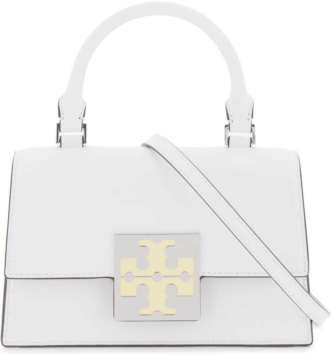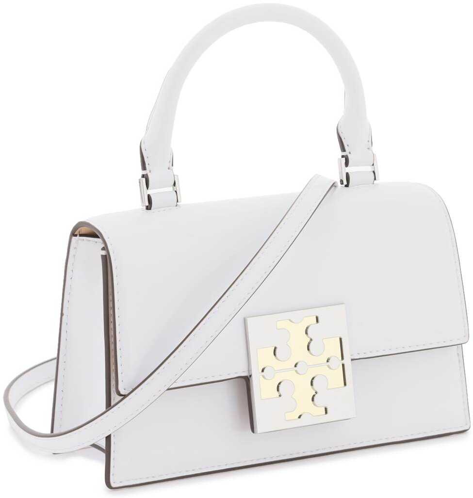 Tory Burch "Bon Bon" glossy spazzolato leather handbag with metal plaque with iconic double T applied to the flap. Magnetic closure, leather interior with two credit card slots, a rear slit pocket and adjustable, detachable shoulder strap. Silver-finished metalware.