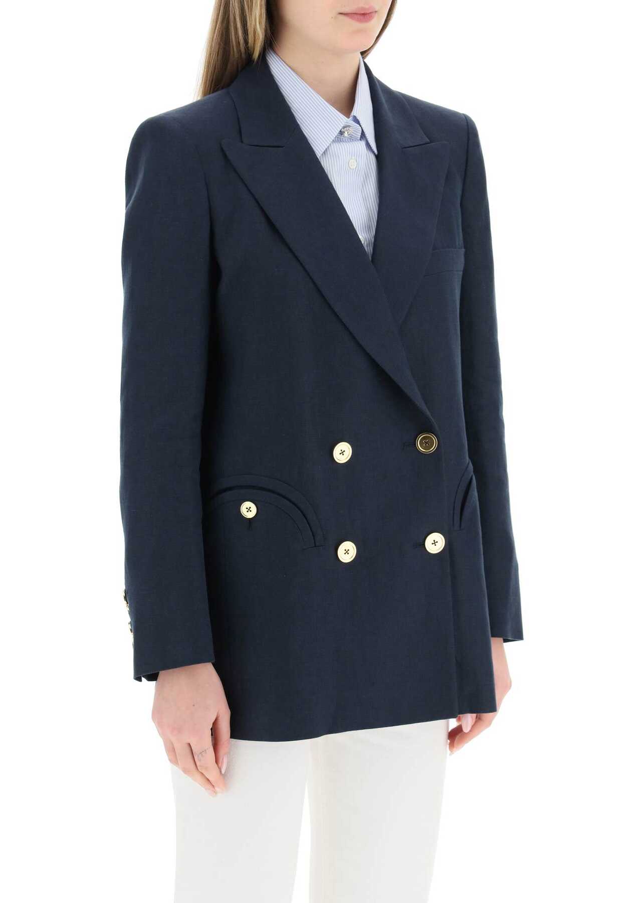 Blazé Milano linen canvas blazer with four gold-tone button closure. It features padded shoulders, peak lapels, smiley pockets, a chest pocket, a central back vent and four-button cuffs. Lined, with four inside pockets. The model height is 177 cm and she is wearing a size 0.