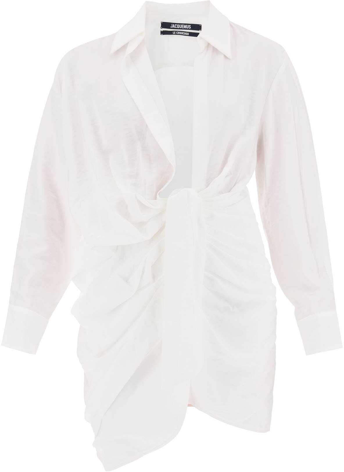 Jacquemus knotted minidress made from light viscose blend fabric, enriched by a plunging neckline on the front with draped asymmetrical skirt. The snug fit has a front closure with concealed buttons and a classic pointed collar. Long raglan sleeves defined by classic single-button cuffs. The model is 177 cm tall and wears a size FR 34.