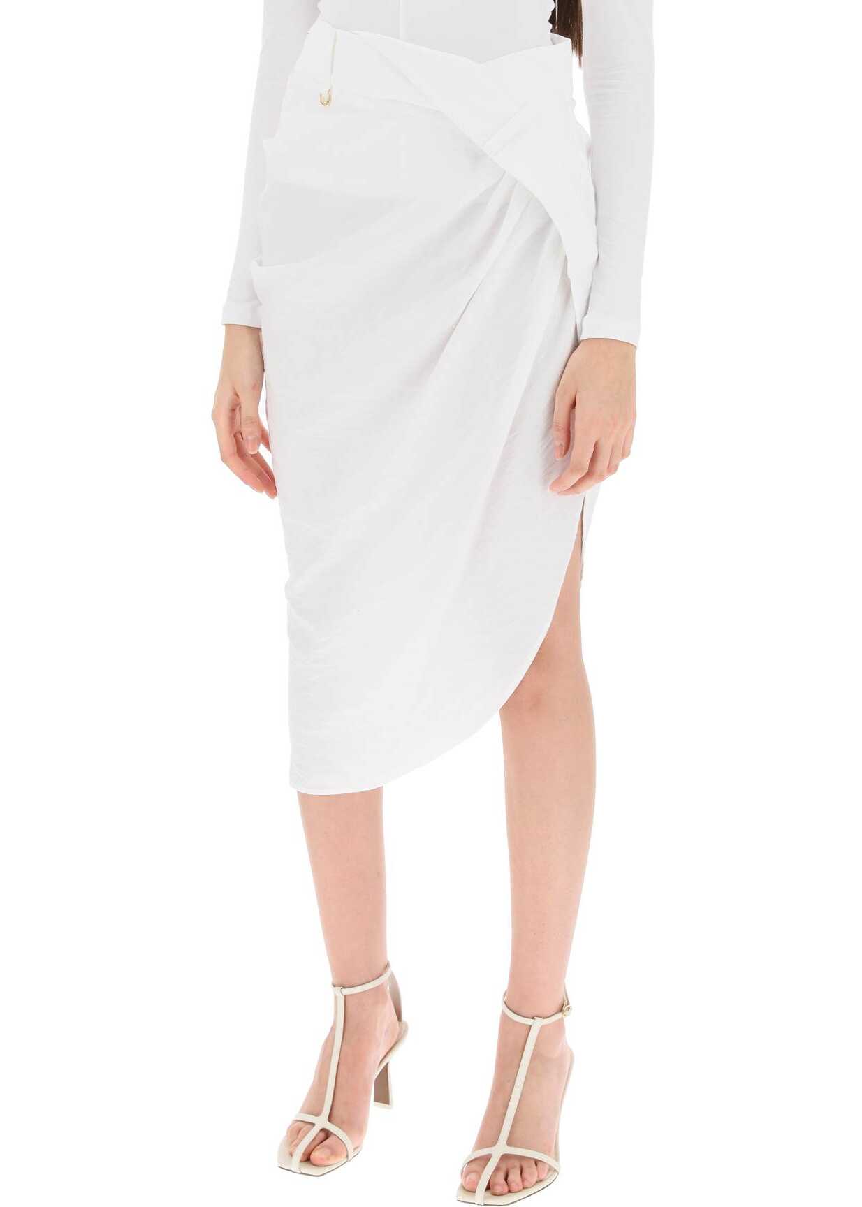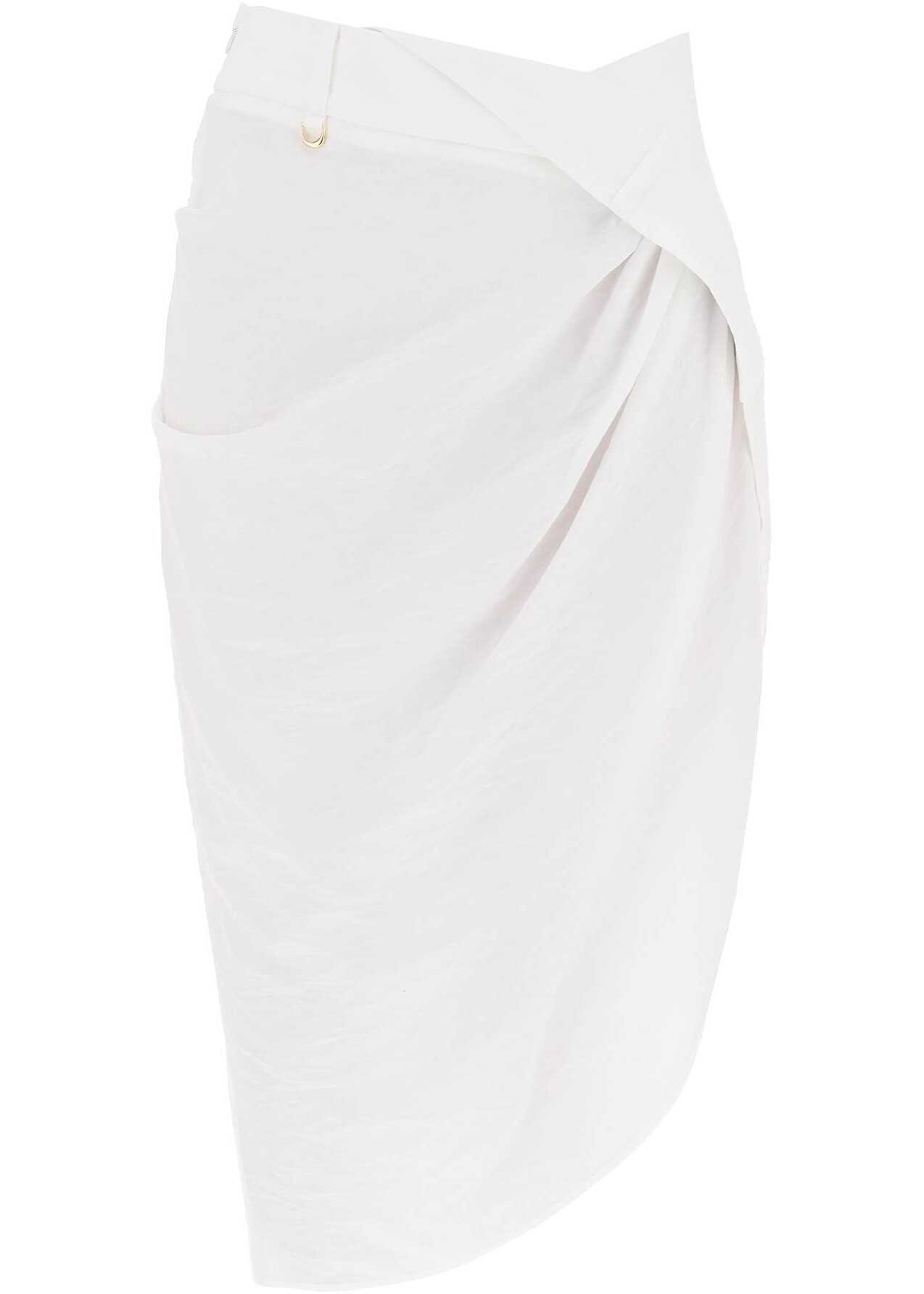 Jacquemus skirt crafted in textured viscose-blend twill, with a draped asymmetric design characterized by a folded panel on the waistband. It features side invisible zipper closure, belt loops with gold-tone metal D-ring on the front and a deep vent on the side. Fitted with below-the-knee length. The model is 177 cm tall and wears a size FR 36.