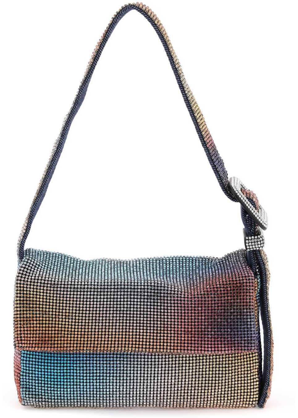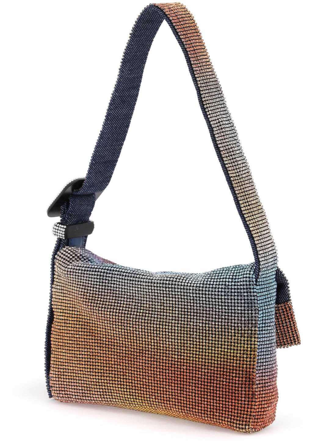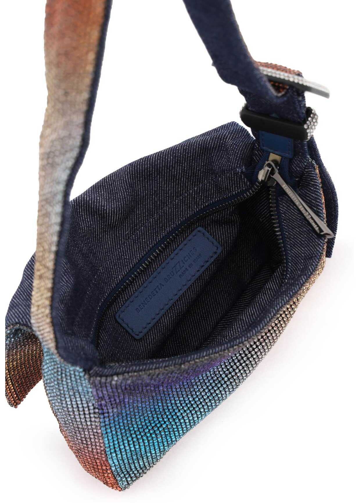 Vitty La Mignon bag by Benedetta Bruzziches handcrafted in metal mesh with multicolored strass. Handle with decorative buckle embellished with all-over rhinestones, zip closure under the flap, denim lining.