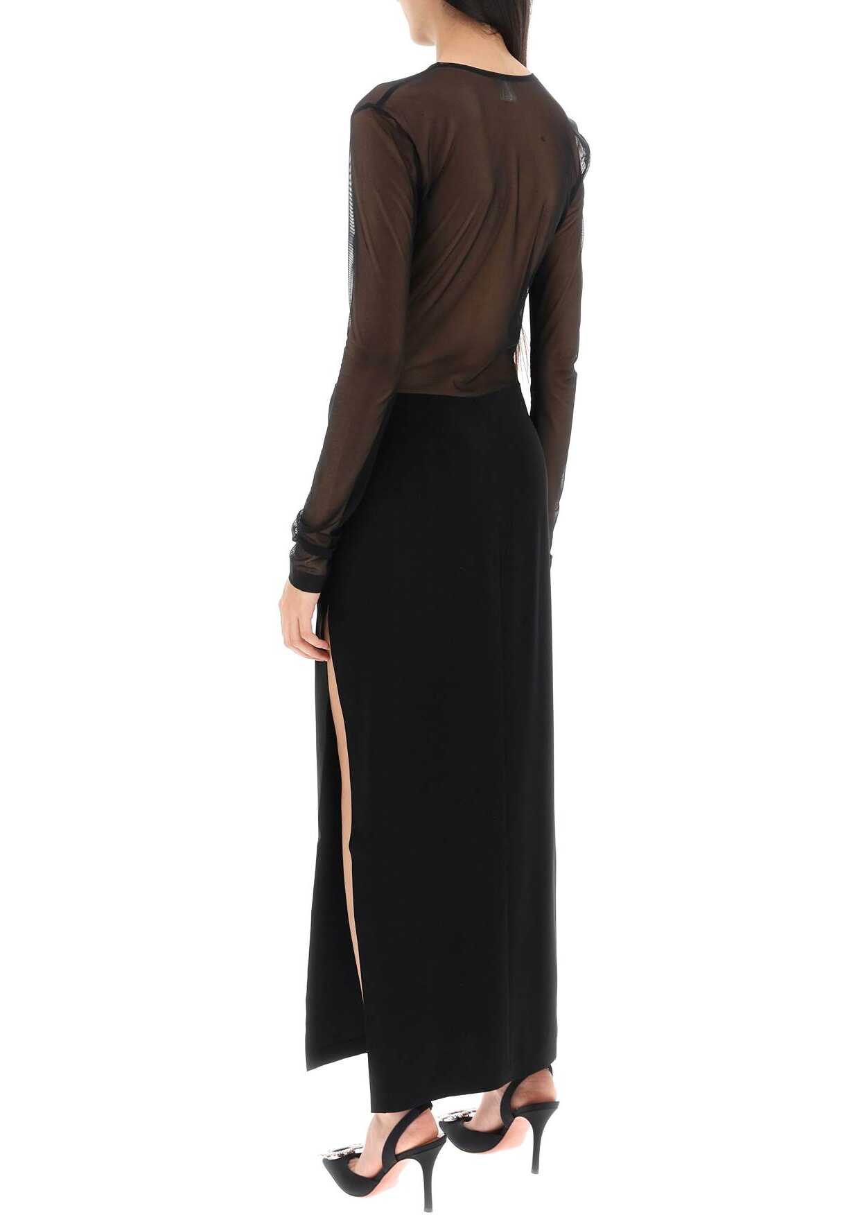 Dash Dash maxi dress by Norma Kamali crafted in Poly Lycra with a sheer mesh bodice provided with a coverage panel at the bust. It features crew neck, long sleeves and a deep slit on the side. Fitted silhouette with straight cut. The model is 177 cm tall and wears size S.