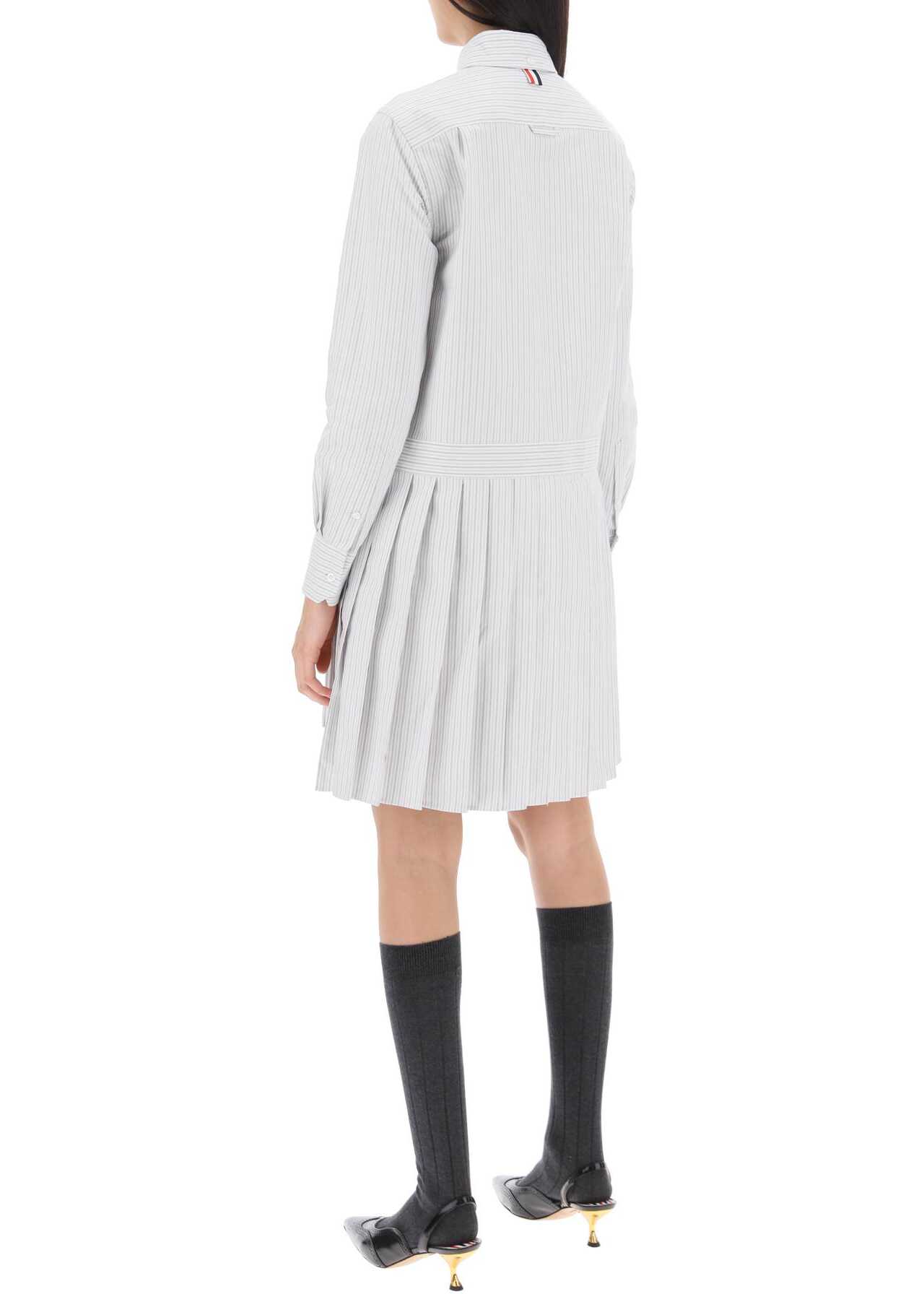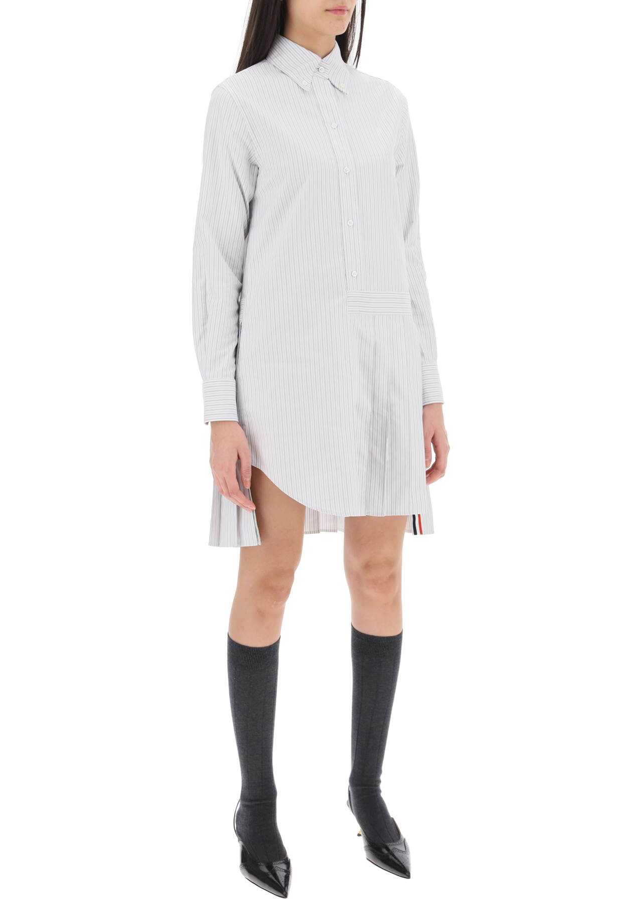 Thom Browne shirt dress made from pure cotton oxford with striped motif all over, characterized by hem with pleated insert. It features button-down collar, american button placket, side invisible zipper closure, single-button angled cuffs and back yoke with side pleats. Enriched by tricolor grosgrain details on the upper back and on the inside of the slits at the hem. Straight silhouette with midi length. The model is 177 cm tall and wears size IT 38.