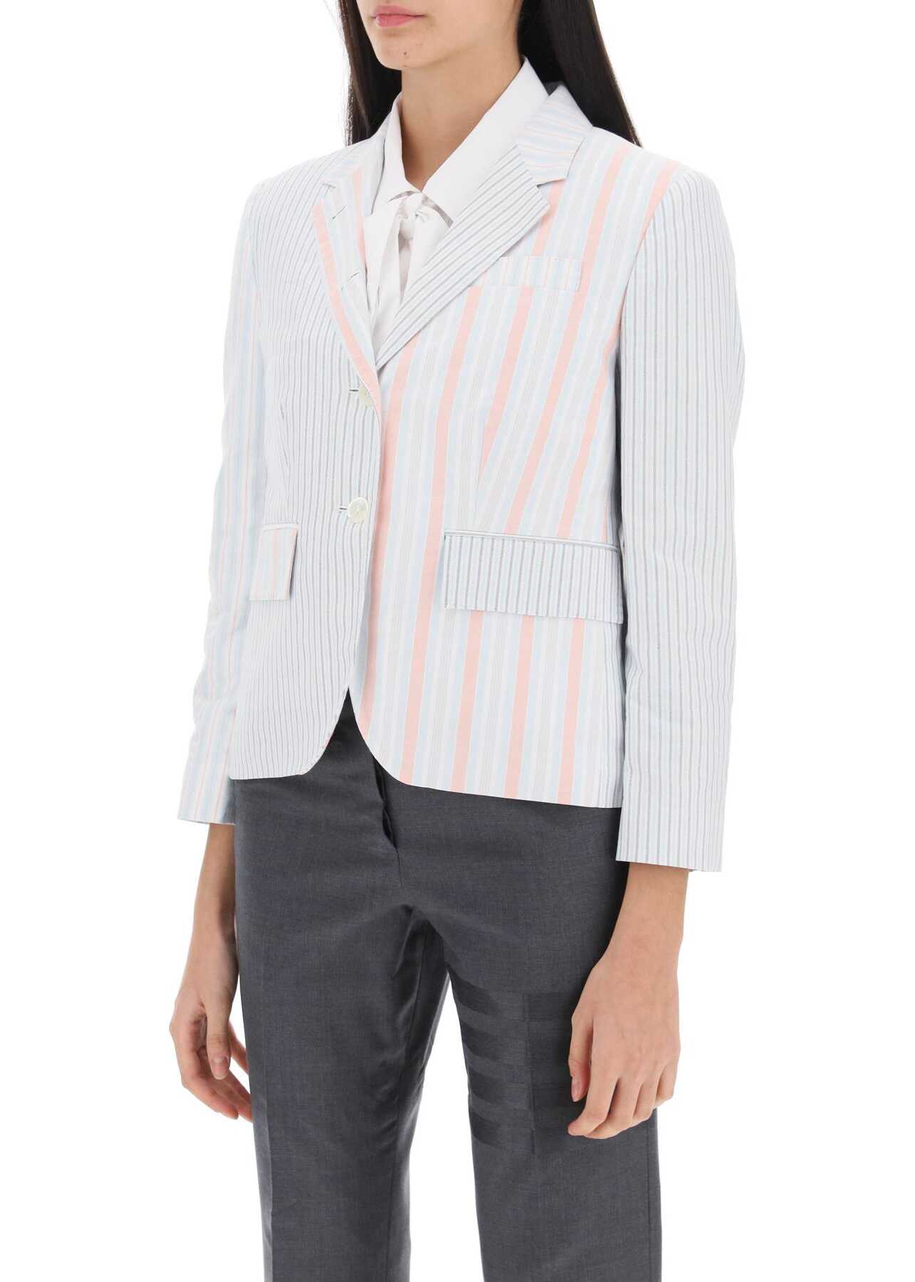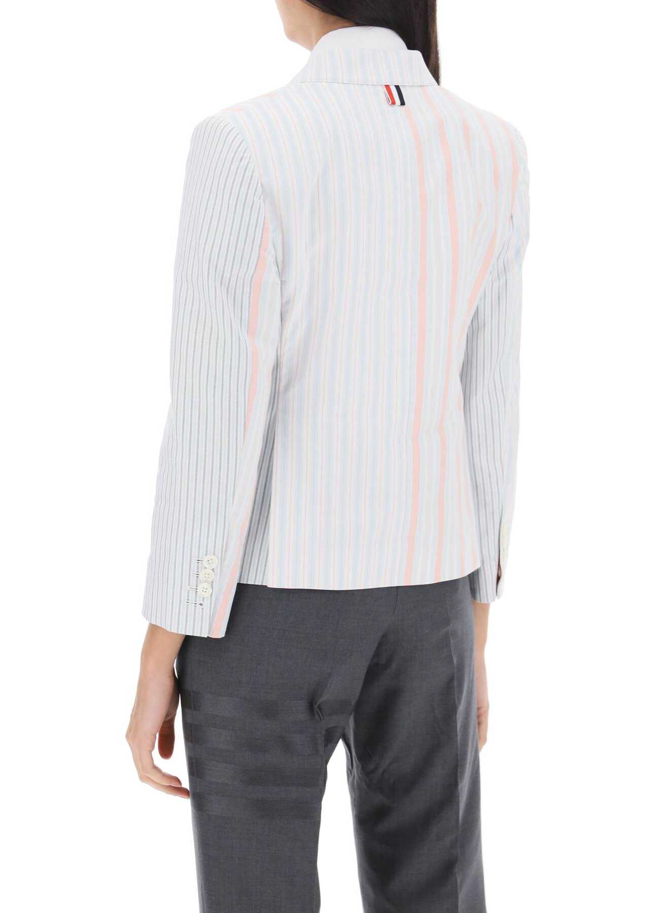 Thom Browne short, fitted blazer made from cotton Oxford in a mix of stripe patterns. This single-breasted style features classic lapels, flap side pockets, a chest pocket, and double back vent. Signature striped grosgrain trims at the cuffs and iconic loop tab at the back of the neck. Half-lined interior equipped with multiple pockets. The model is 177 cm tall and wears a size IT 40.