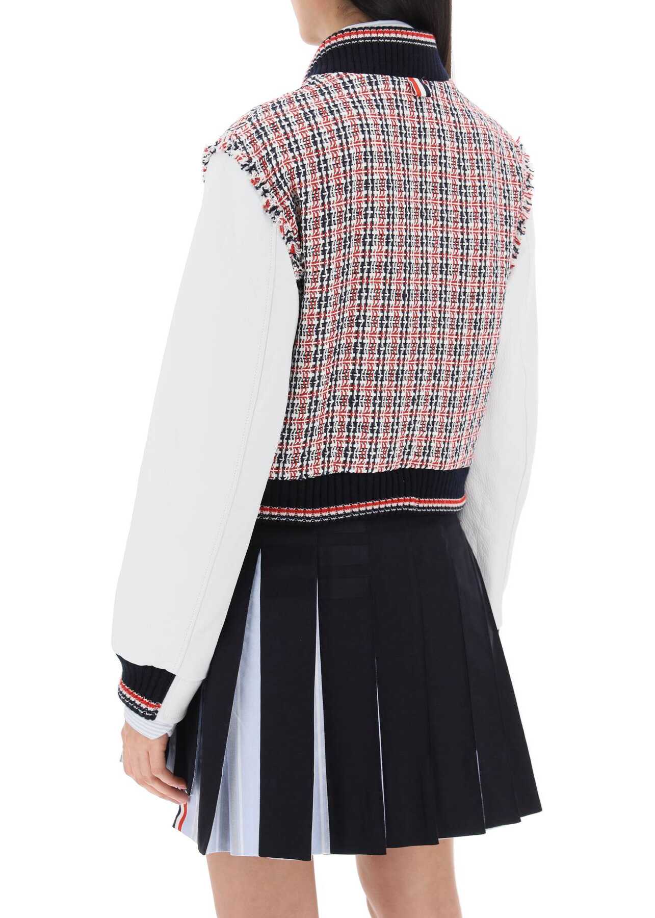 Thom Browne bomber jacket crafted in pure cotton tweed, with grained leather sleeves in solid colour and fringed trims. It features crew neck, cuffs and hem in tricolor ribbed knit, front closure and leather-trimmed pockets with gold-tone metal logo press studs. Lined in striped cupro and provided with pockets on the inside. Regular fit. The model is 177 cm tall and wears size IT 40.