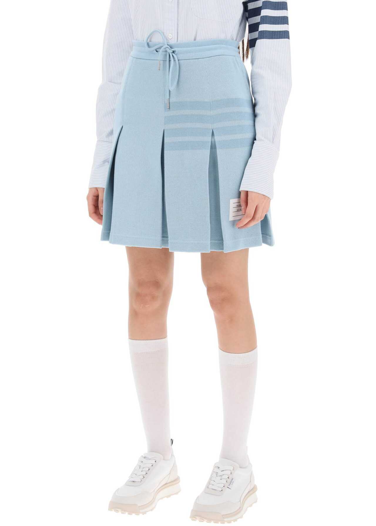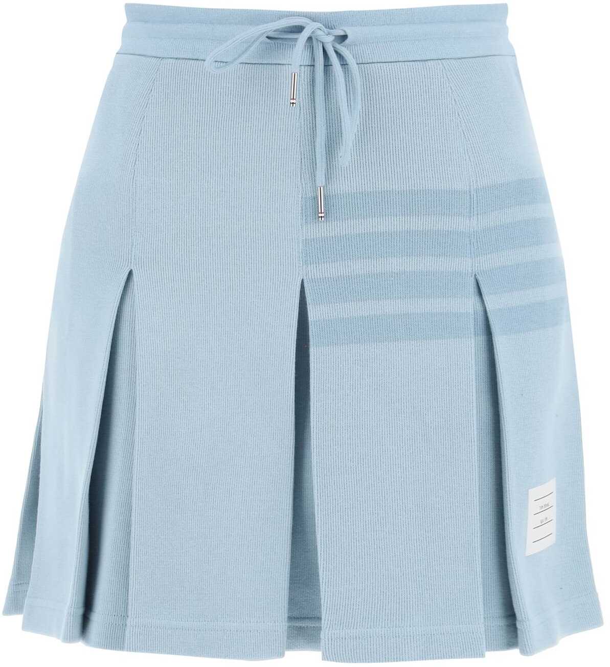 Thom Browne skirt made from pure cotton knit, with tonal engineered 4-Bar motif on the hip. It features elasticated waistband with drawstring, Name Tag on the hem and tricolor grosgrain loop tab on the back of the waist. Regular fit. The model is 177 cm tall and wears size IT 38.