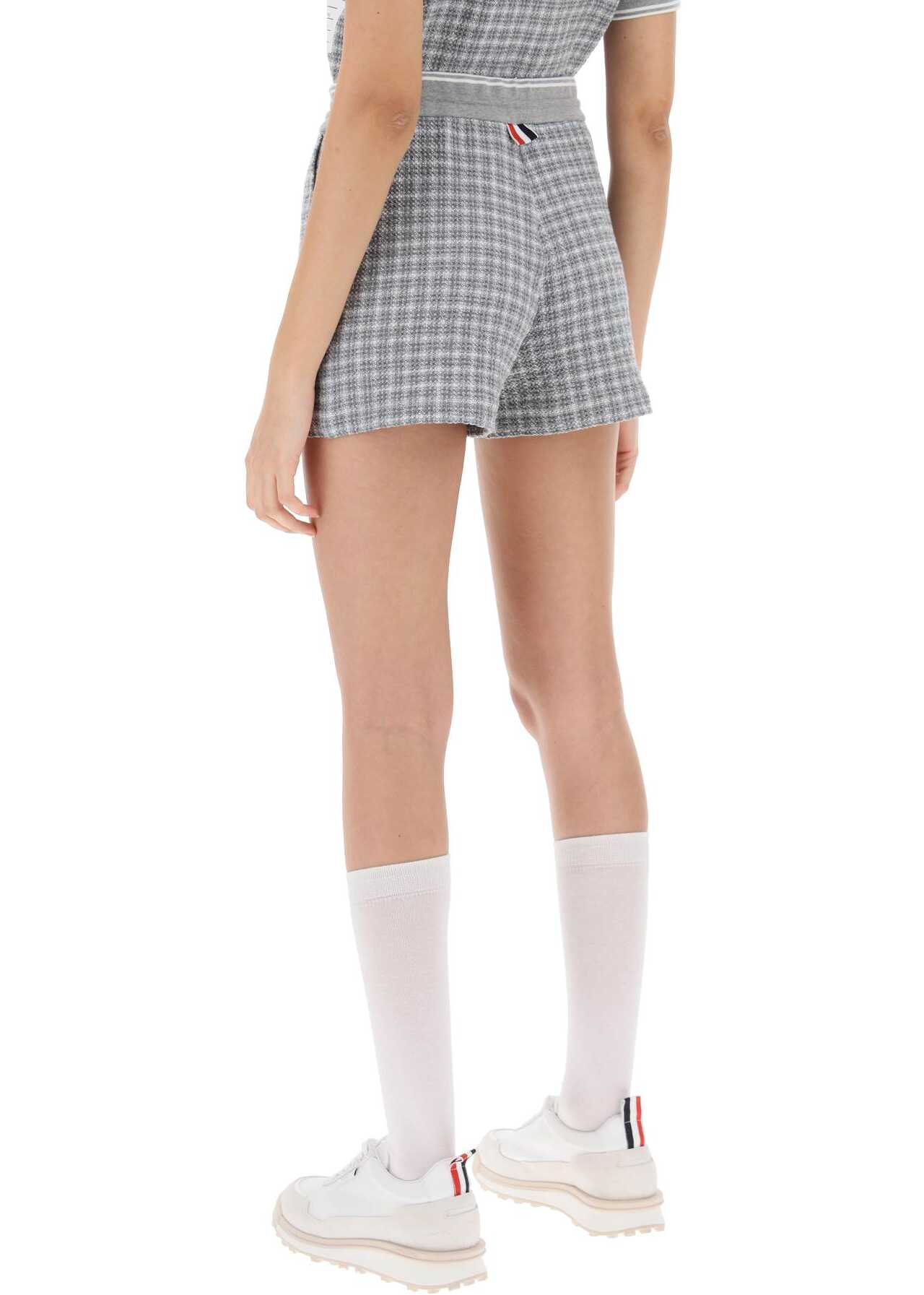 Thom Browne sweatshorts crafted in cotton-blend tweed with check pattern all over. They feature drawstring waistband in two-tone ribbed knit and side slash pockets. Branded with Name Tag on the front and with tricolor grosgrain loop tab on the back of the waist. Loose fit. The model is 177 cm tall and wears size IT 38.