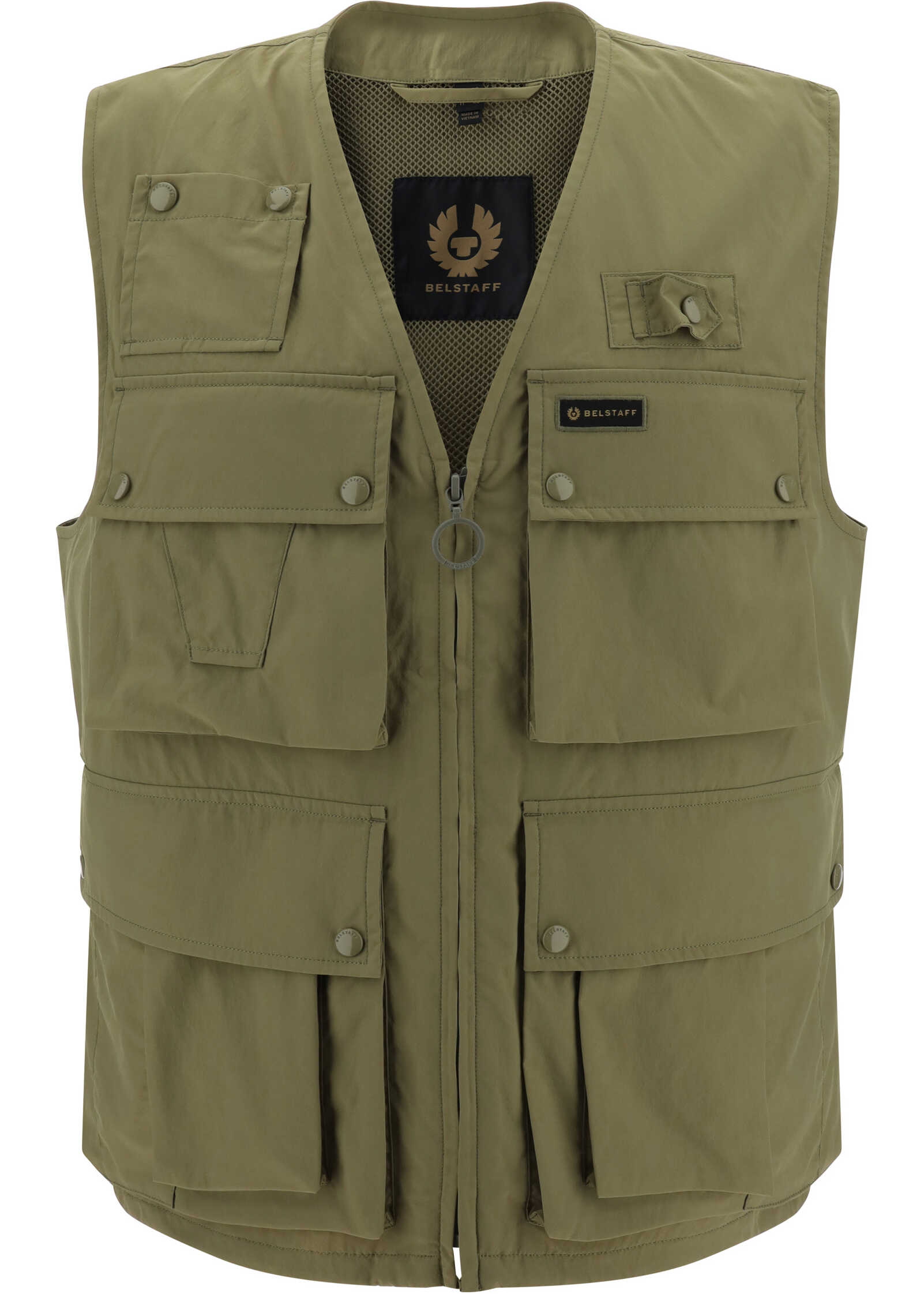 Castmaster Vest by Belstaff, V-neck front, front zipper closure, four front patch cargo pockets, monochrome pattern, regular fit.