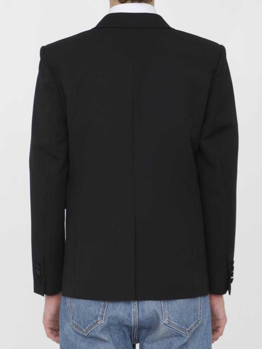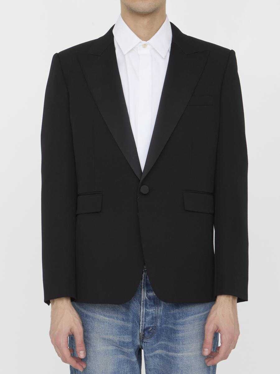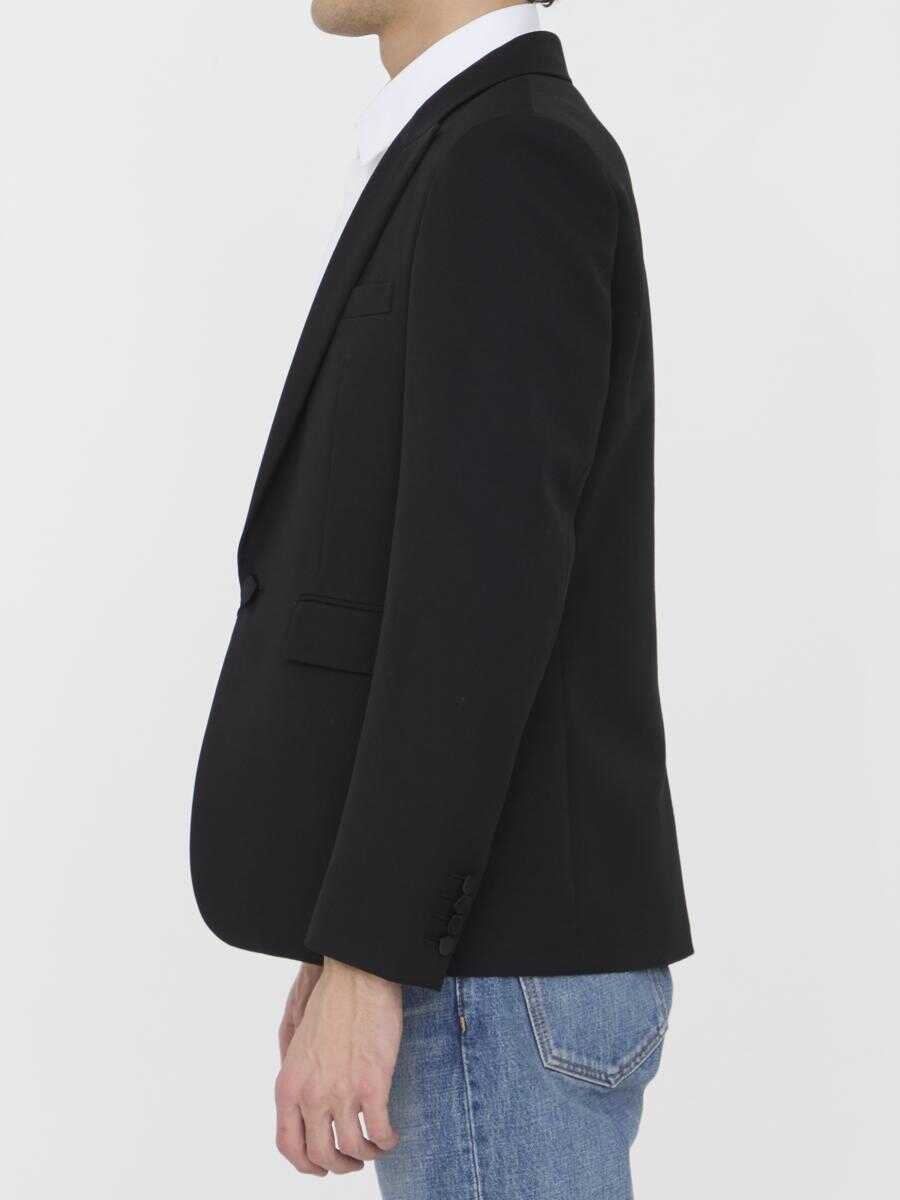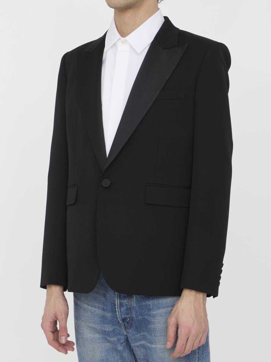 Tuxedo jacket in black grain de poudre. It features satin lapels, padded shoulders, single-breasted closure with a single button, two front flap pockets, a welt pocket on chest, buttoned cuffs and back vent. Silk lining. Regular fit.