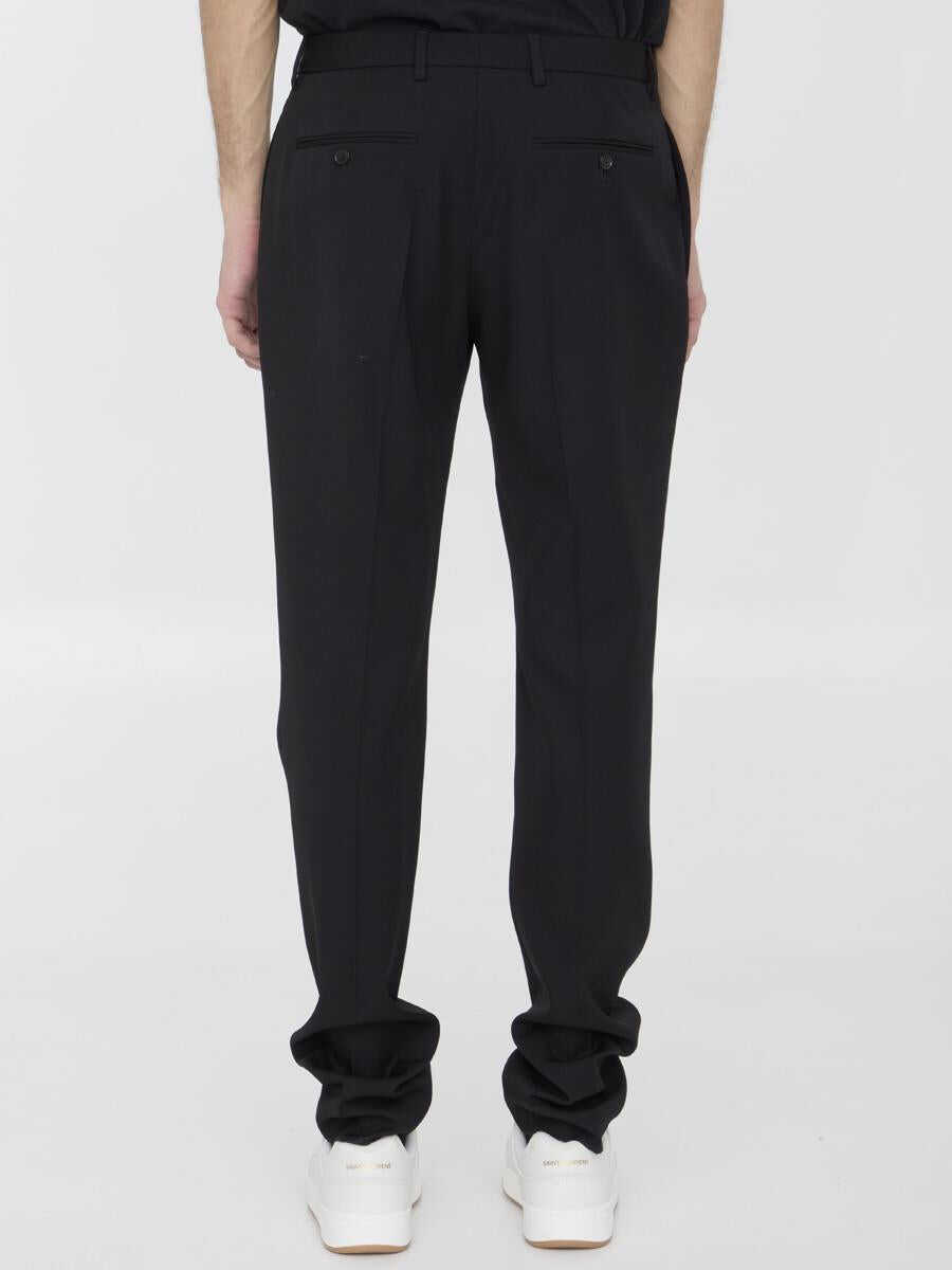 Black wool trousers. It features zip, button and hook-and-eye closure, two side welt pockets and two rear buttoned welt pockets. Slim fit.