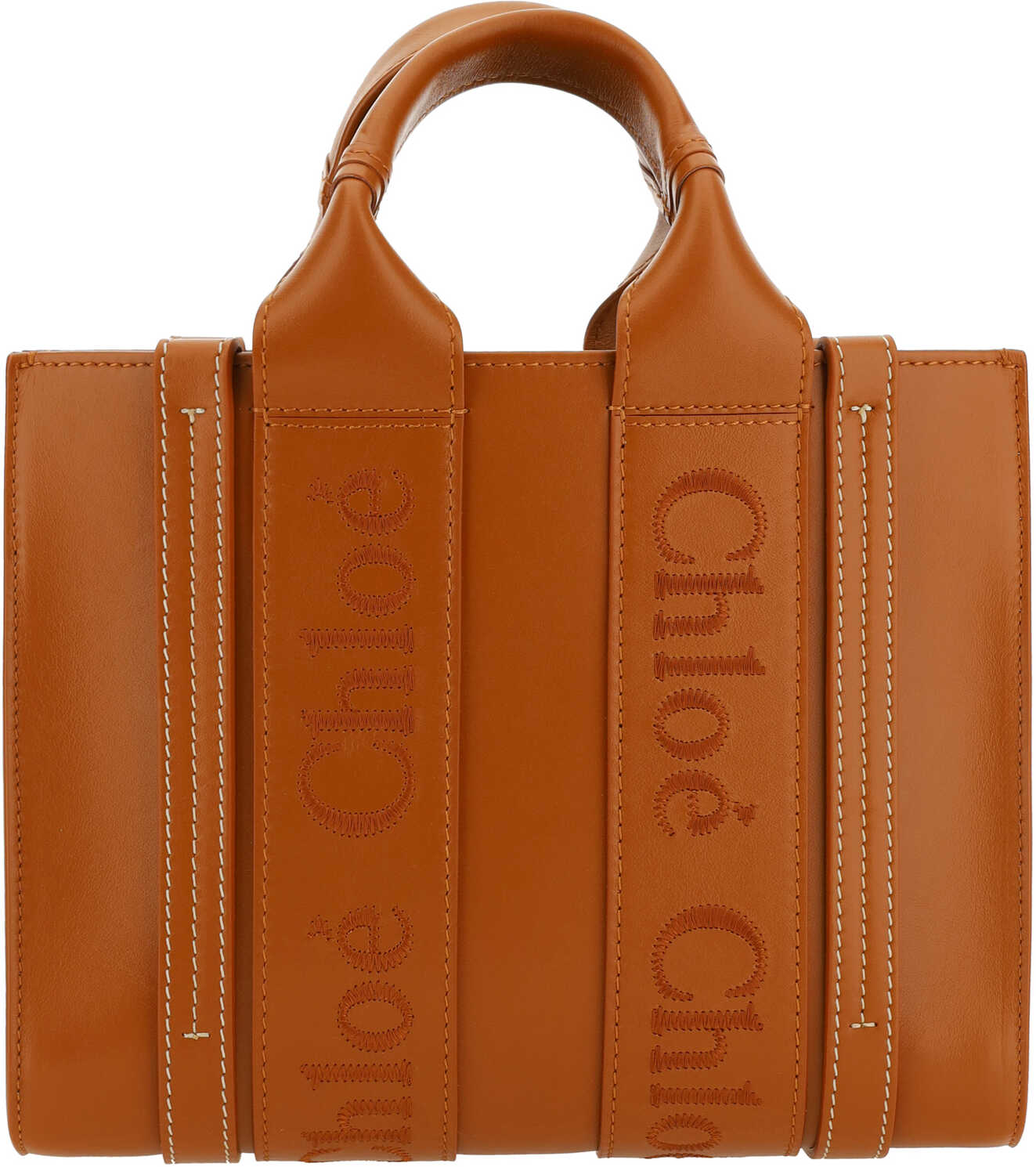 Calfskin Woody Handbag by Chloé, double stiff handles at top, applique and logoed handle extensions along side panels, adjustable and removable flat shoulder strap, single interior compartment.