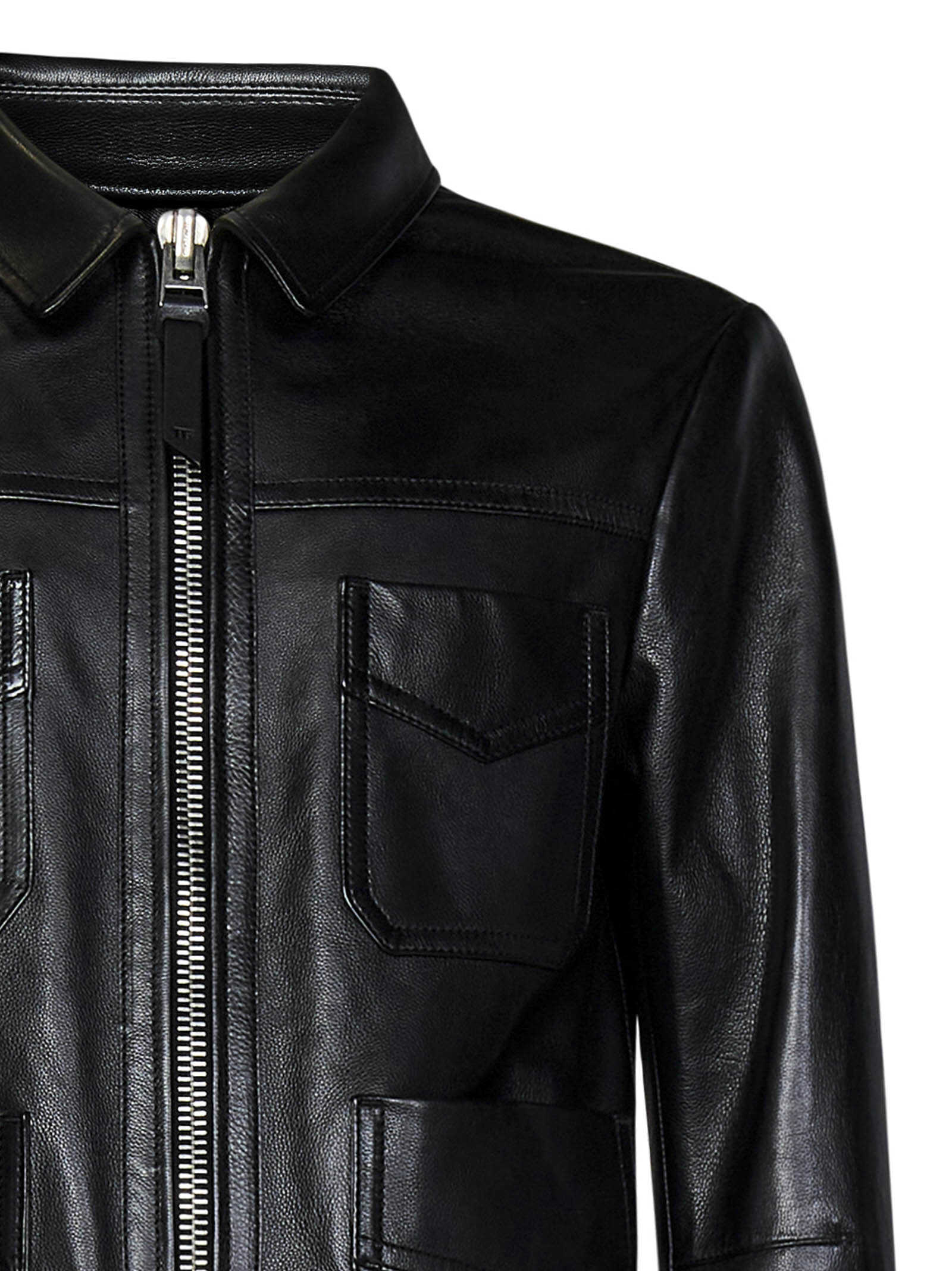 Black grained calf leather unlined blouson with four patch pockets at front.