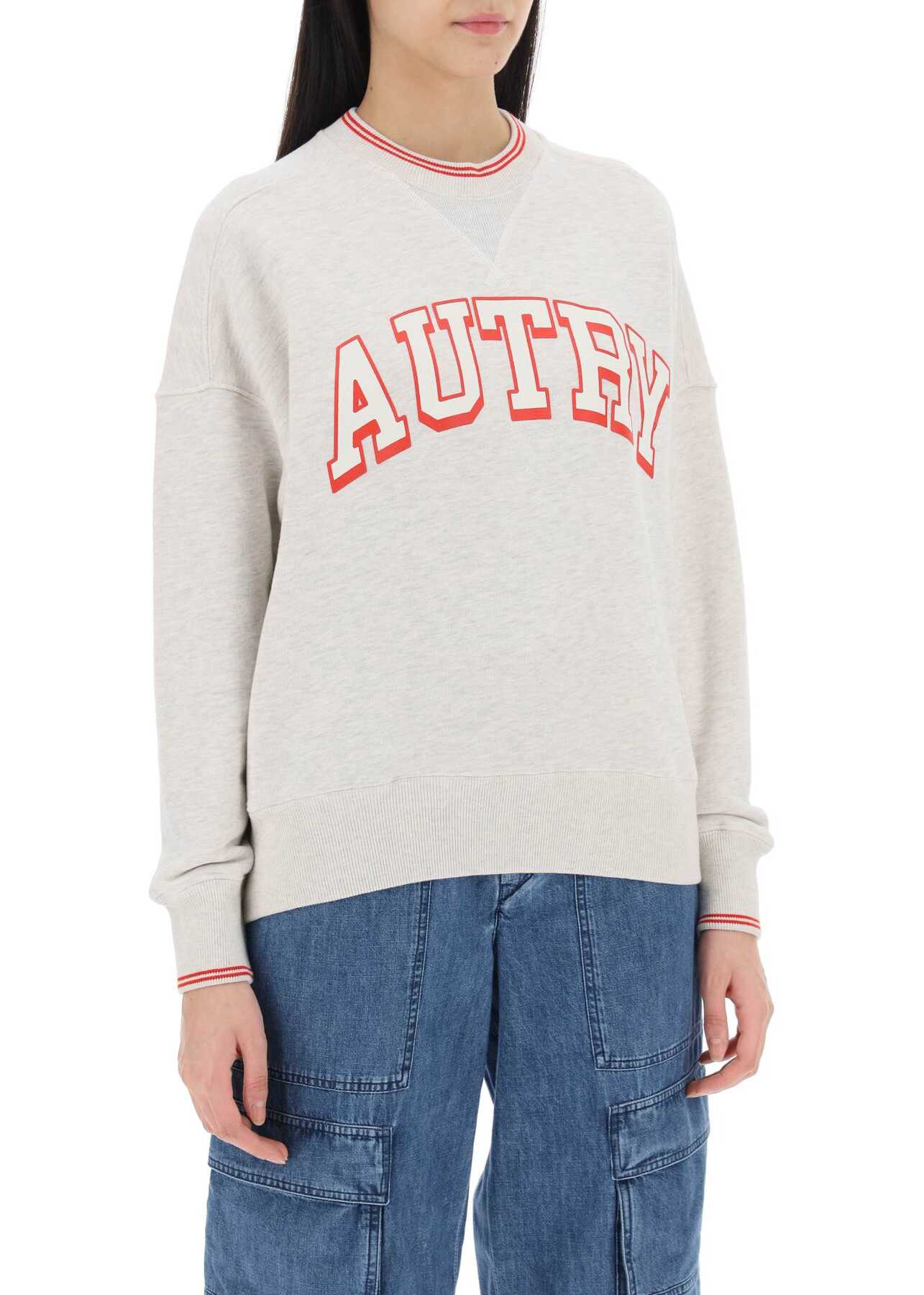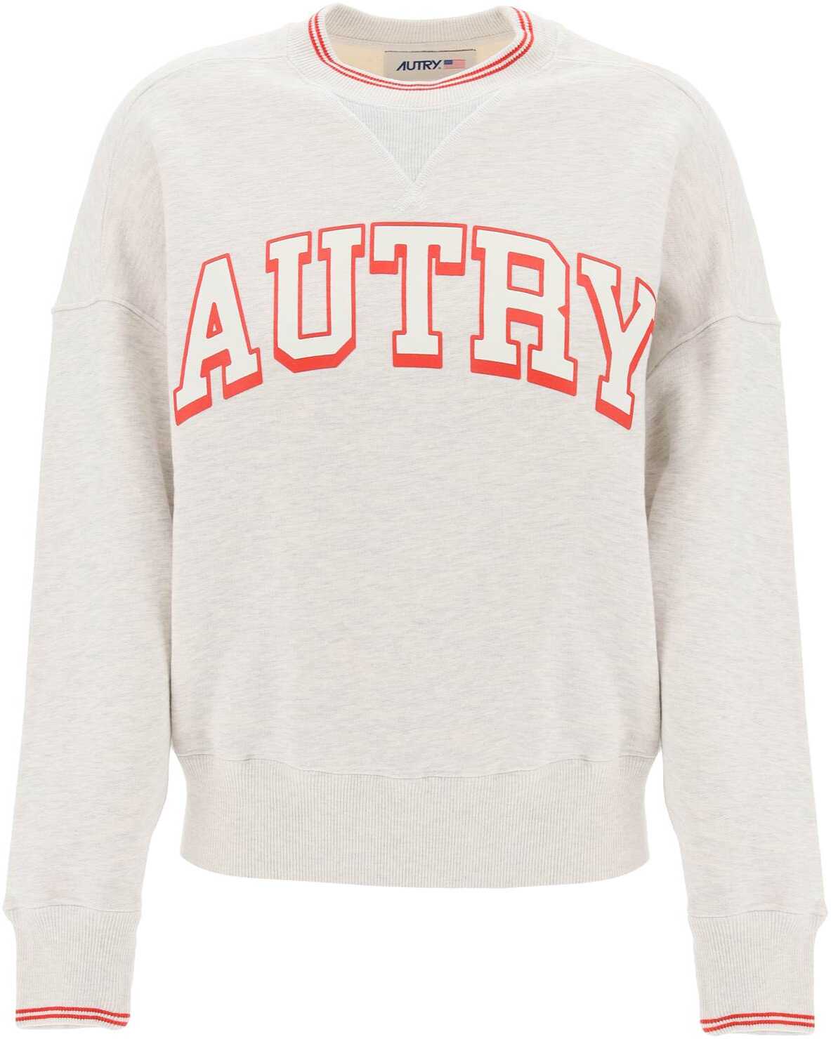 Crafted of soft melange cotton-blend French terry, this oversized Autry sweatshirt is designed in a varsity style, featuring a front logo print, ribbed trims with contrast stripe detailing, and a crew neck with V-insert. The model is 177 cm tall and wears a size XS.