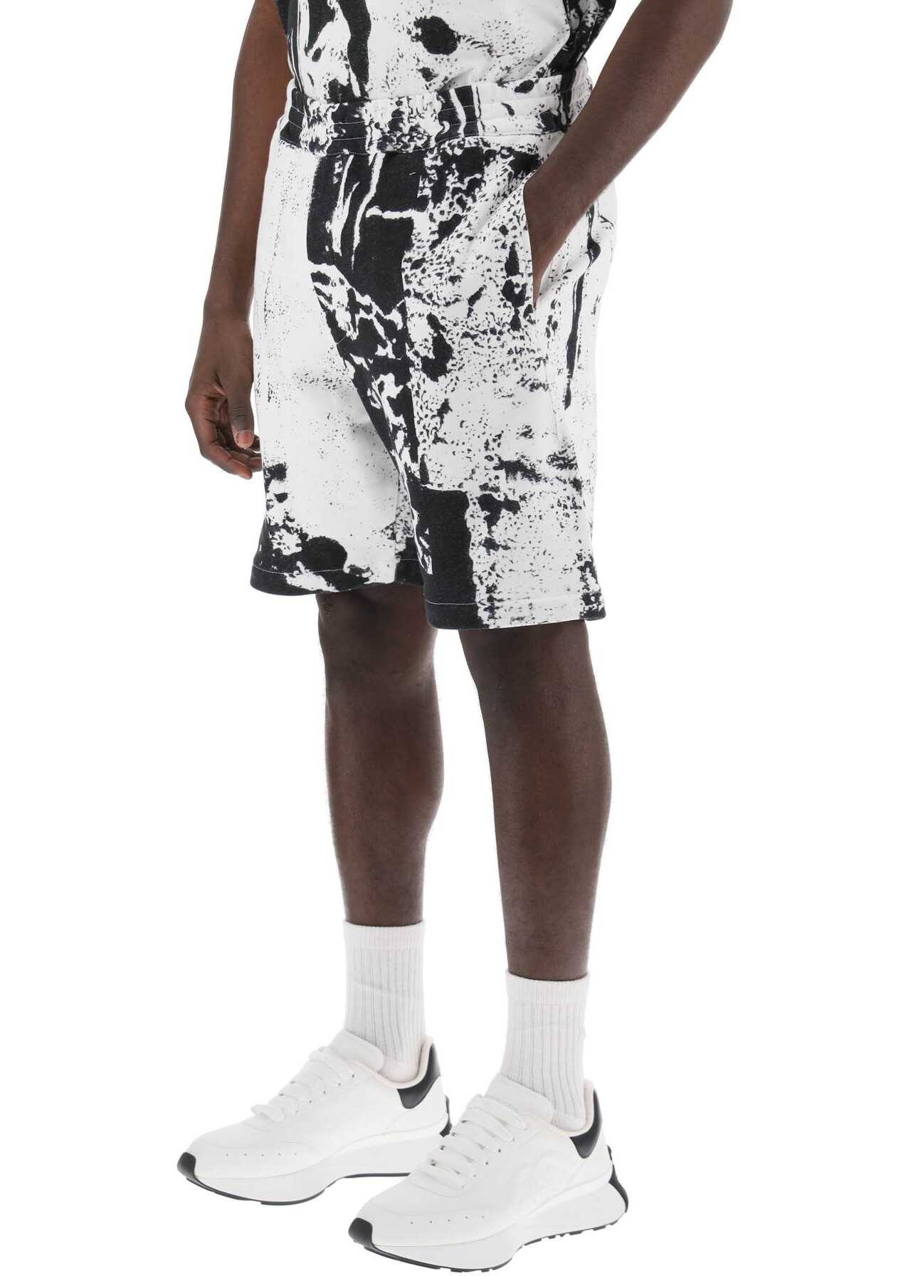 Made of loopback organic cotton jersey with an all-over Fold print, these sweat shorts feature an elasticated waistband with internal drawstring, a zip fly, and side seam pockets. At the back, they are finished with a contrast embroidered Alexander McQueen signature and a zip pocket. Regular fit. The model is 187 cm tall and wears a size L.