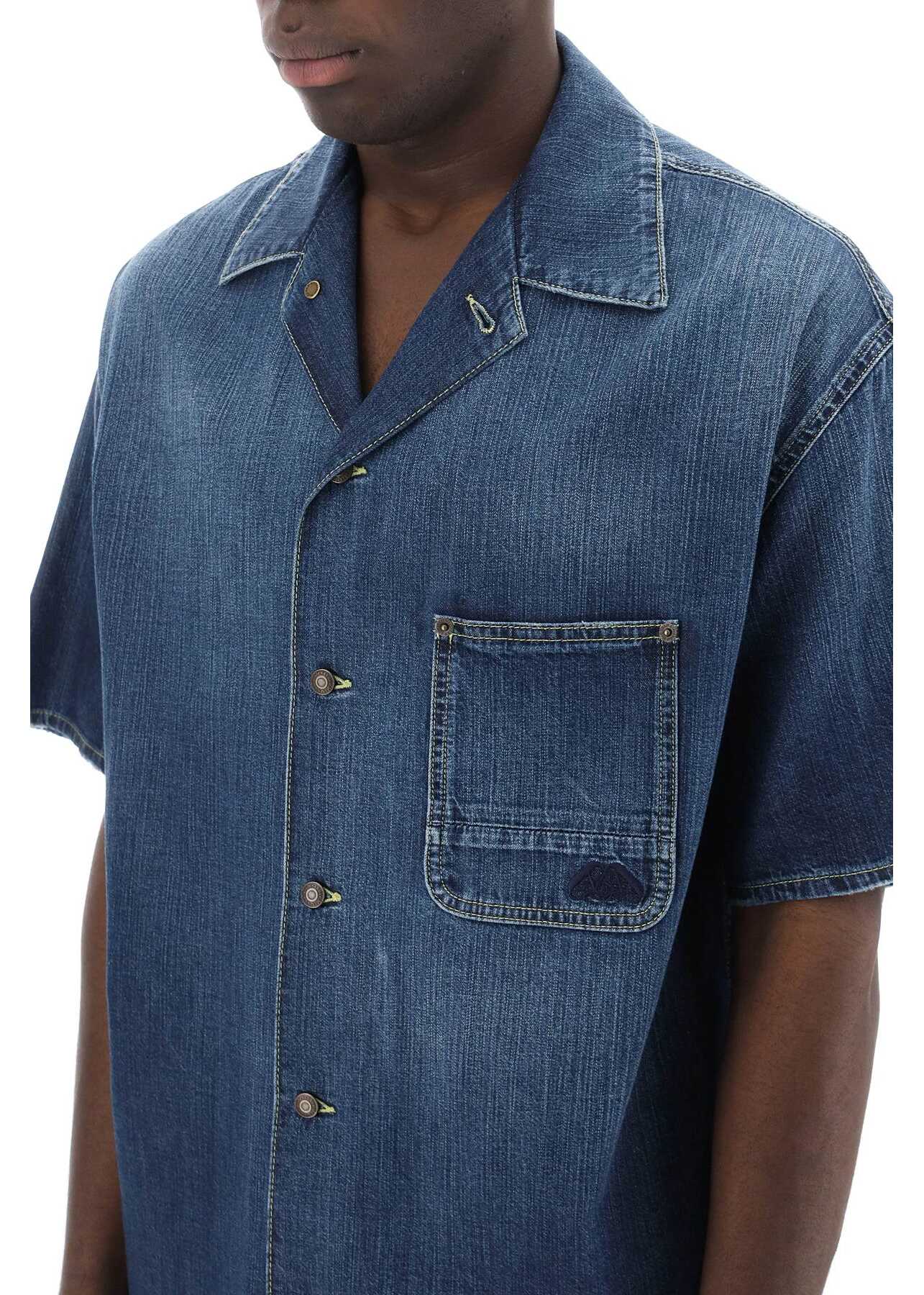Made from lightweight organic denim to a boxy fit, this button-up shirt from Alexander McQueen features a short-sleeved design with a convertible collar and a chest pocket embroidered with a Seal logo. Small side vents on the straight hem. The model is 187 cm tall and wears a size IT 48.