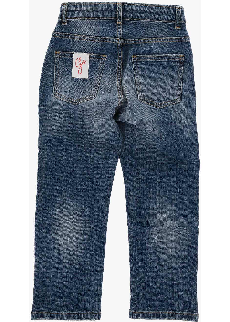 Belt loops Logo Denim cotton 5 pockets Stretch Buttons Contrasting stitch detailing Blue Made in Italy Spring-Summer Materials: 99% Co, 1% Ea Product code: P568526 Sample Size: 6Y - Waist: 27cm - Length: 71cm - Ankle: 15cm
