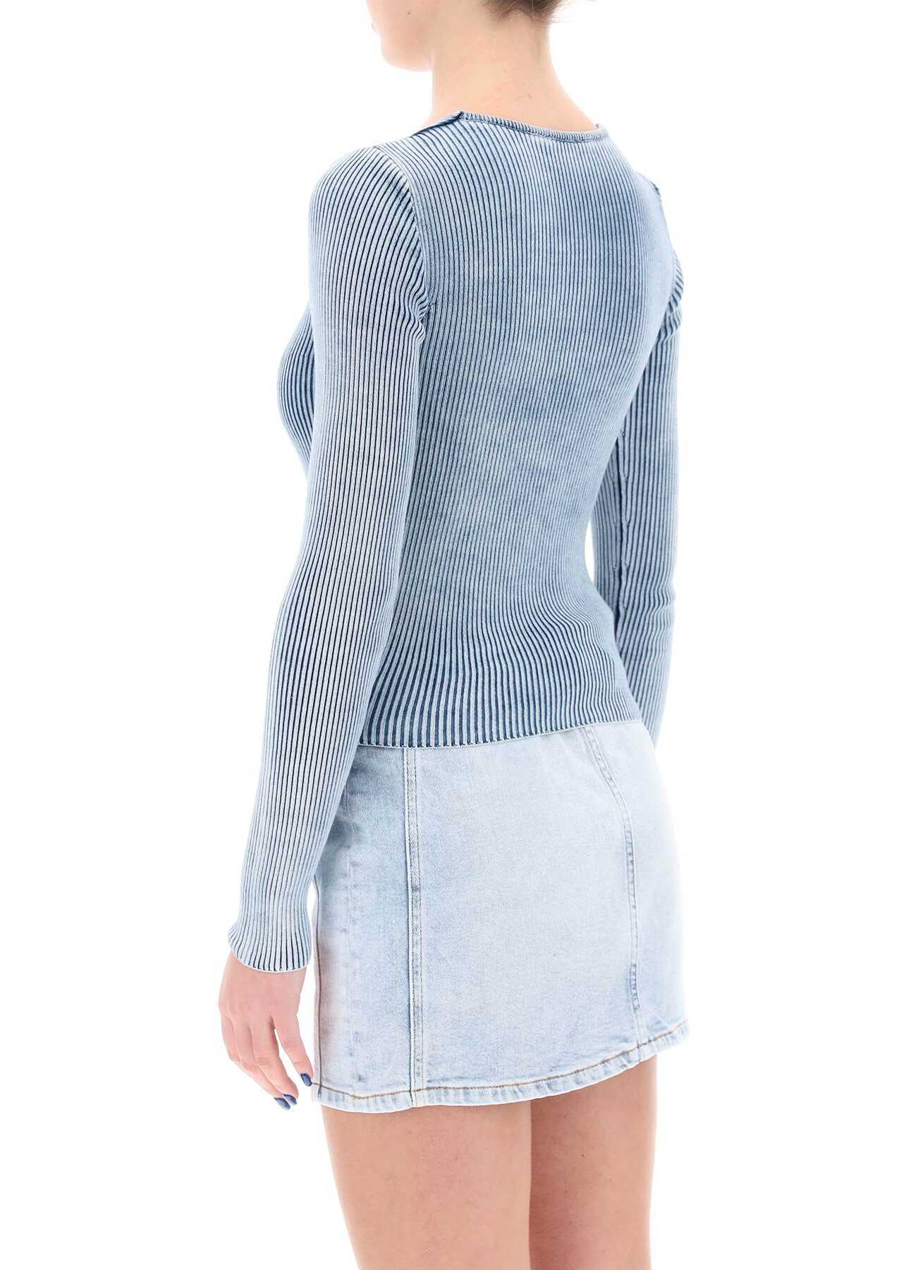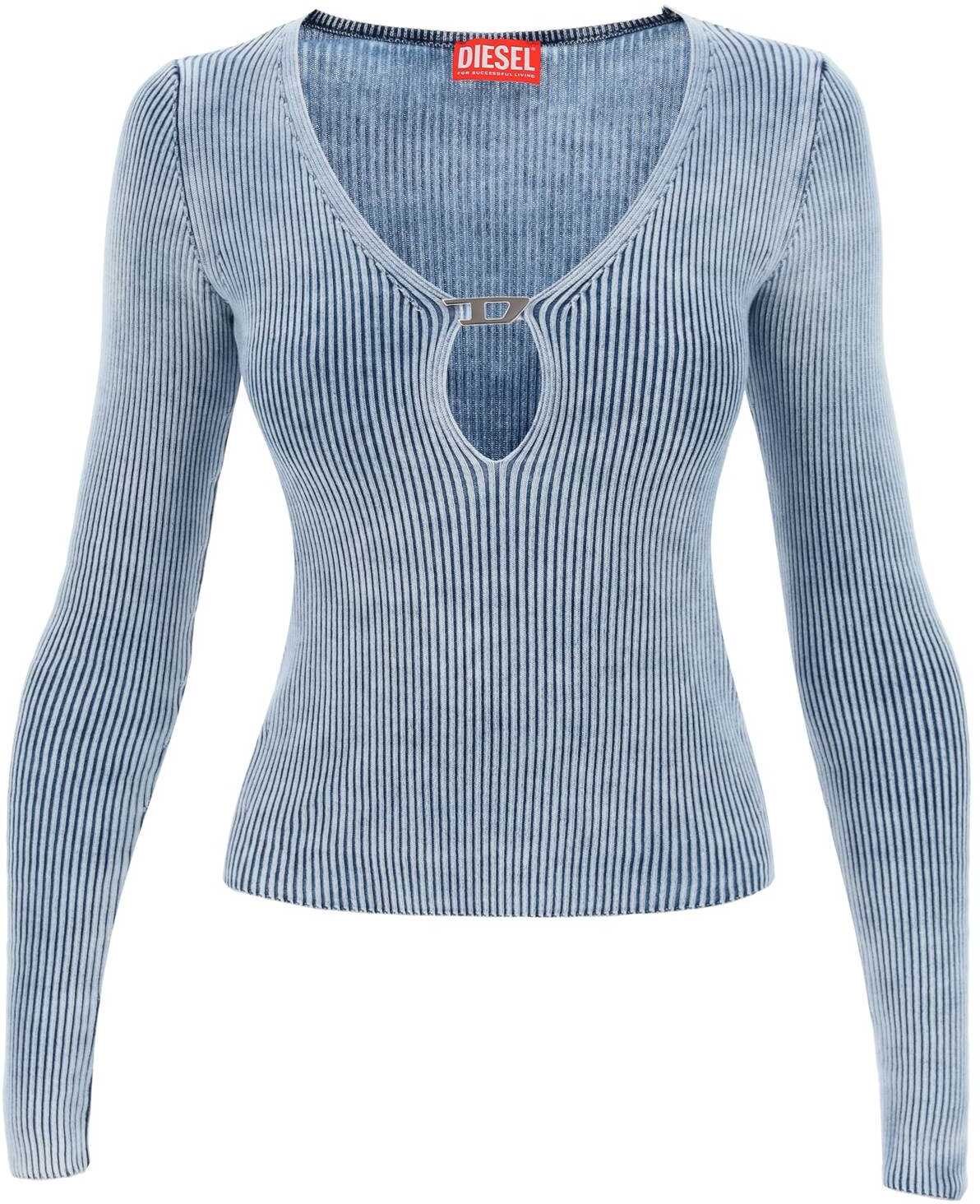 Diesel sweater crafted in bleached-effect ribbed cotton knit, with V neck enriched by cut out and metal D plaque on the chest. Fitted. The model is 177 cm tall and wears size XS.