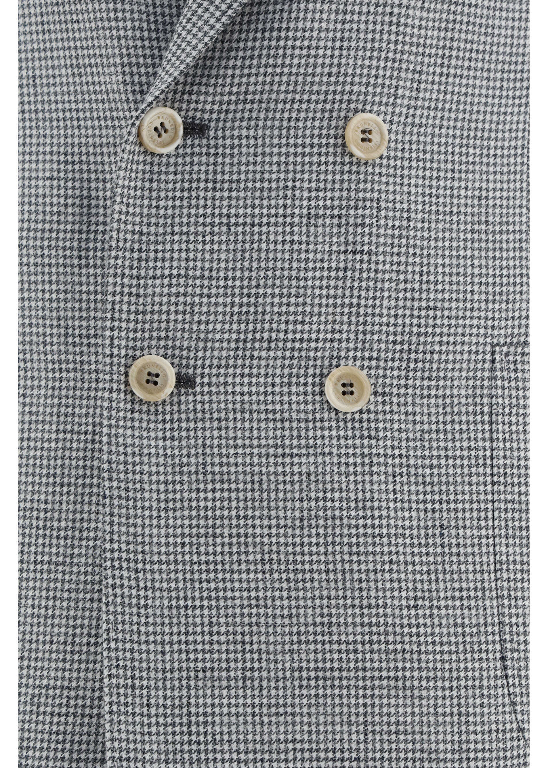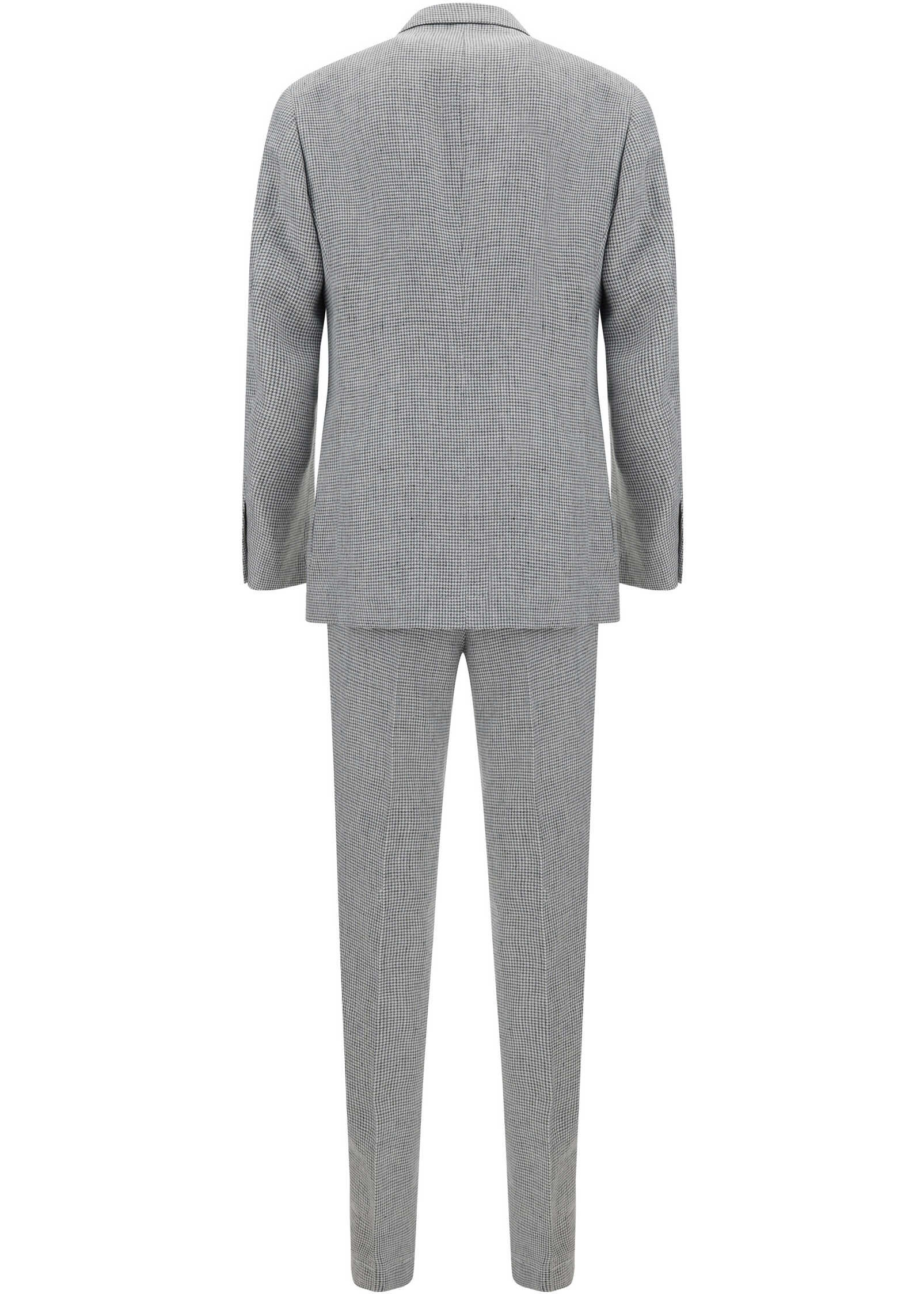 Linen Suit by Brunello Cucinelli, consisting of jacket and pants. Linen blazer jacket, double-breasted front button closure, two welt pockets on the front, one slit pocket on the front, wide peaked lapels. Classic linen pants, front zipper and button closure, two side slit pockets, two welt pockets on the back, belt loops waistband, all-over plaid pattern.