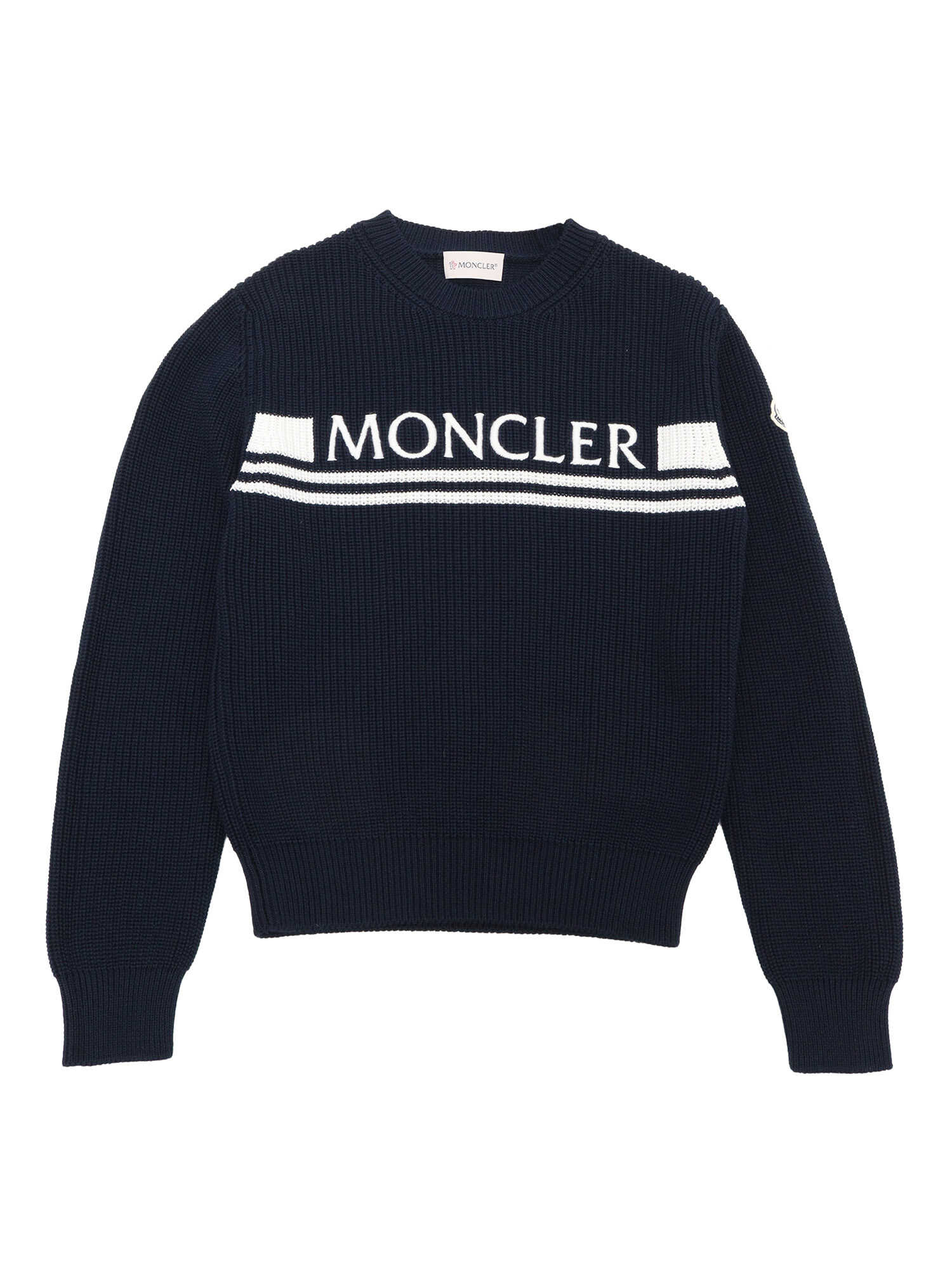 Moncler blue ribbed sweater for children with contrasting logo, crew neckline, logo plate applied on the sleeve.
