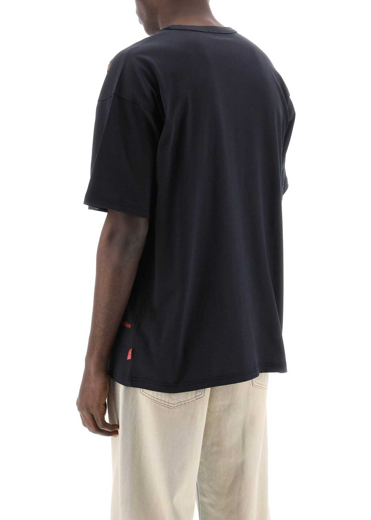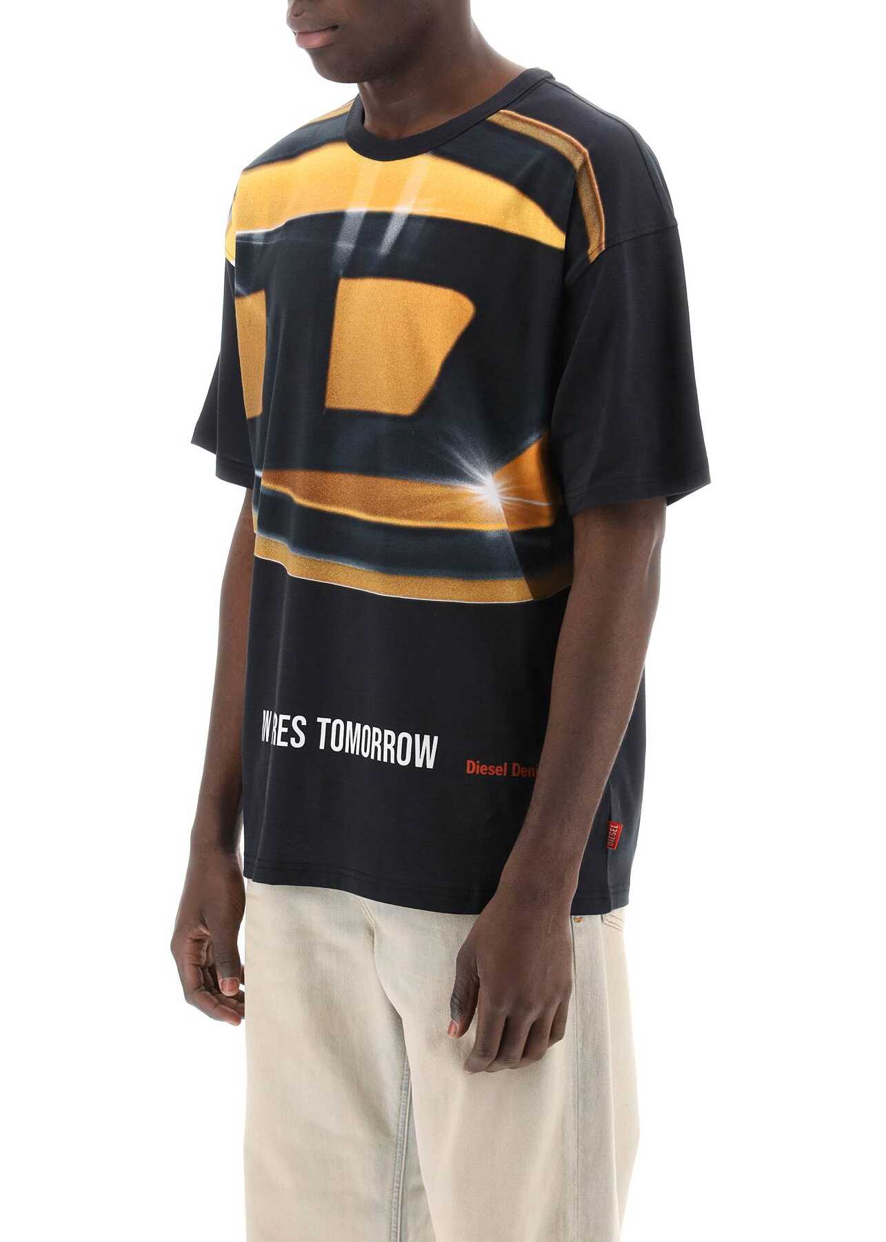 An oversized Diesel T-shirt featuring a maxi logo print at the front. Made of pure cotton jersey, it is finished with a ribbed crew neck. The model is 187 cm tall and wears a size L.