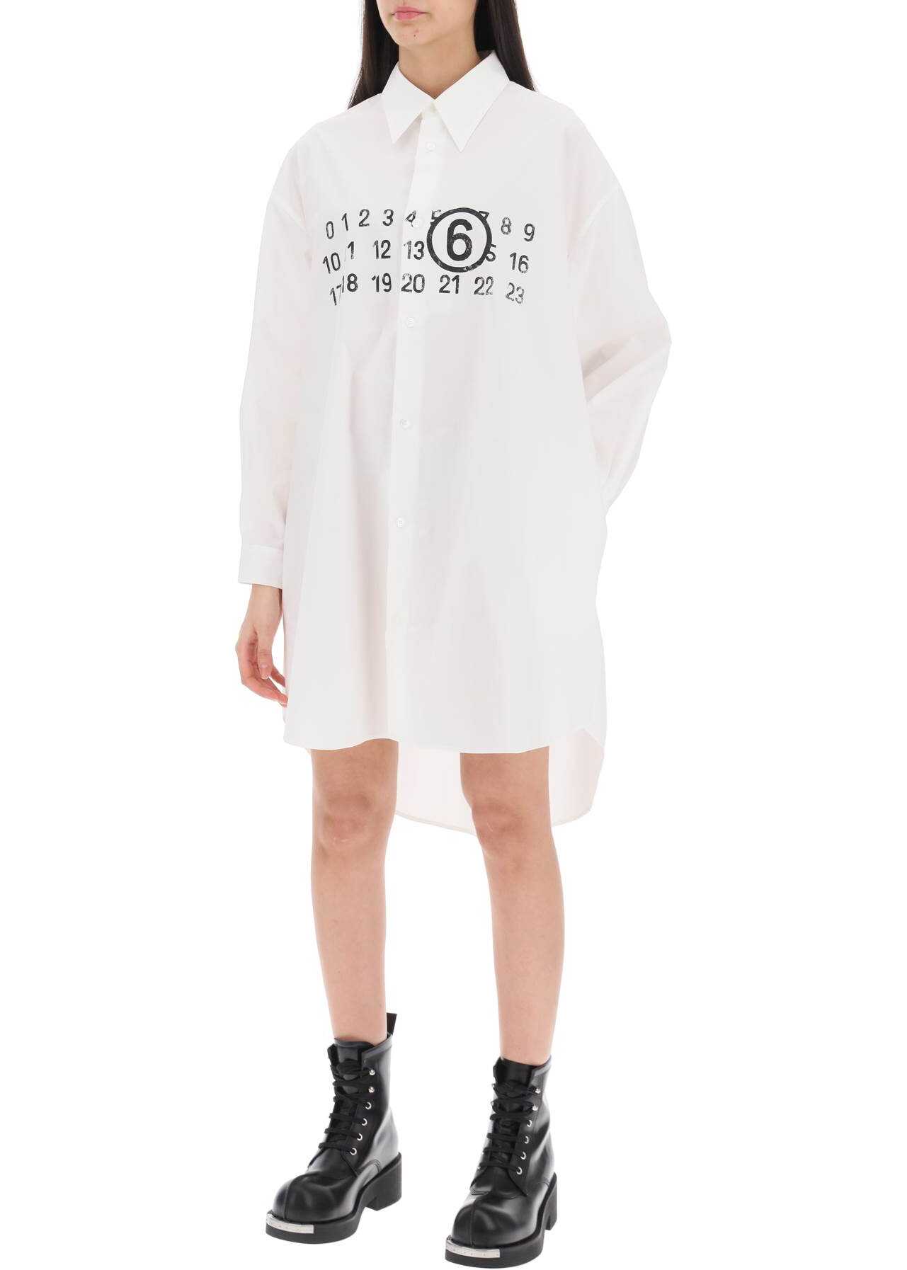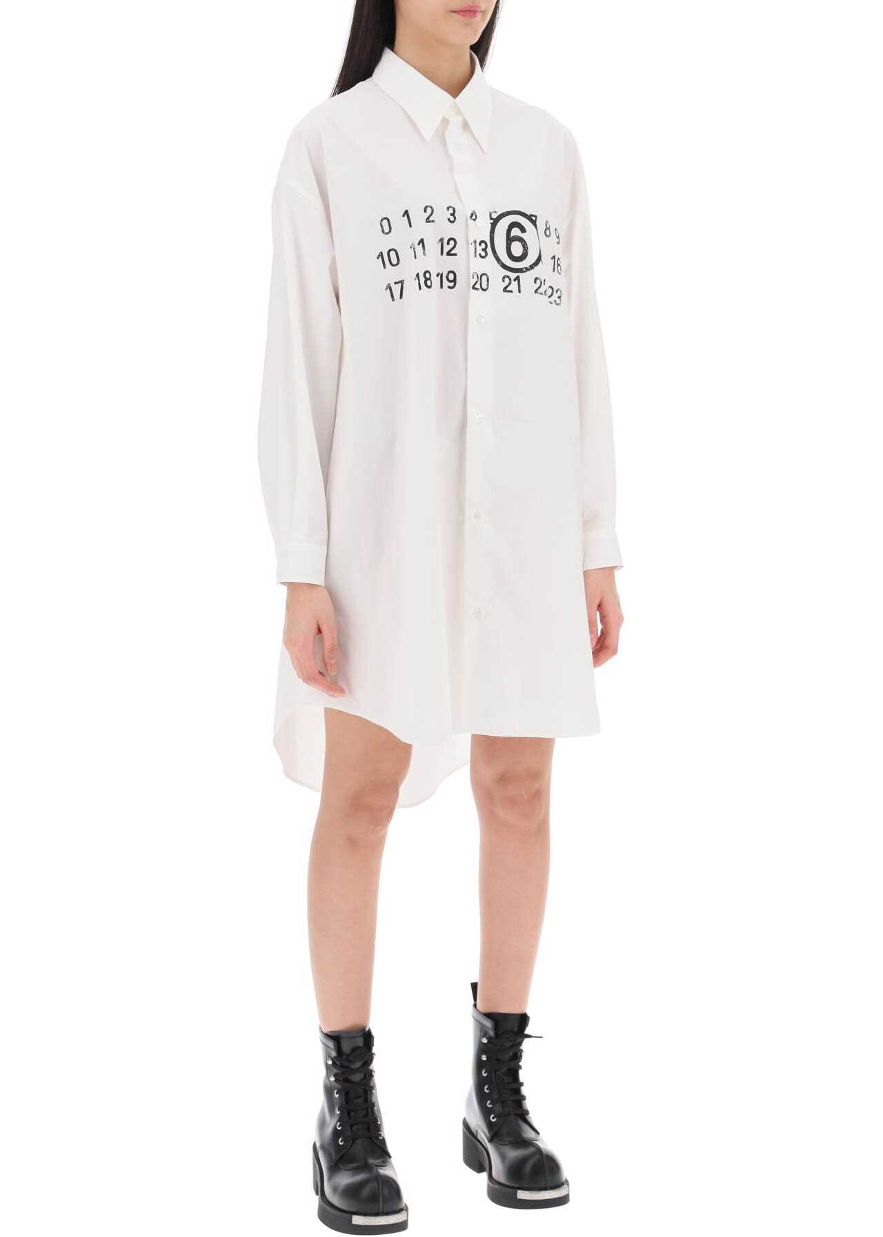 MM6 Maison Margiela mini shirt dress crafted in pure cotton poplin with numeric logo print on the chest. It features italian collar, french button placket, buttoned barrel cuffs, inseam pockets and dropped back hem. Oversized fit with flared silhouette. The model is 177 cm tall and wears size S.