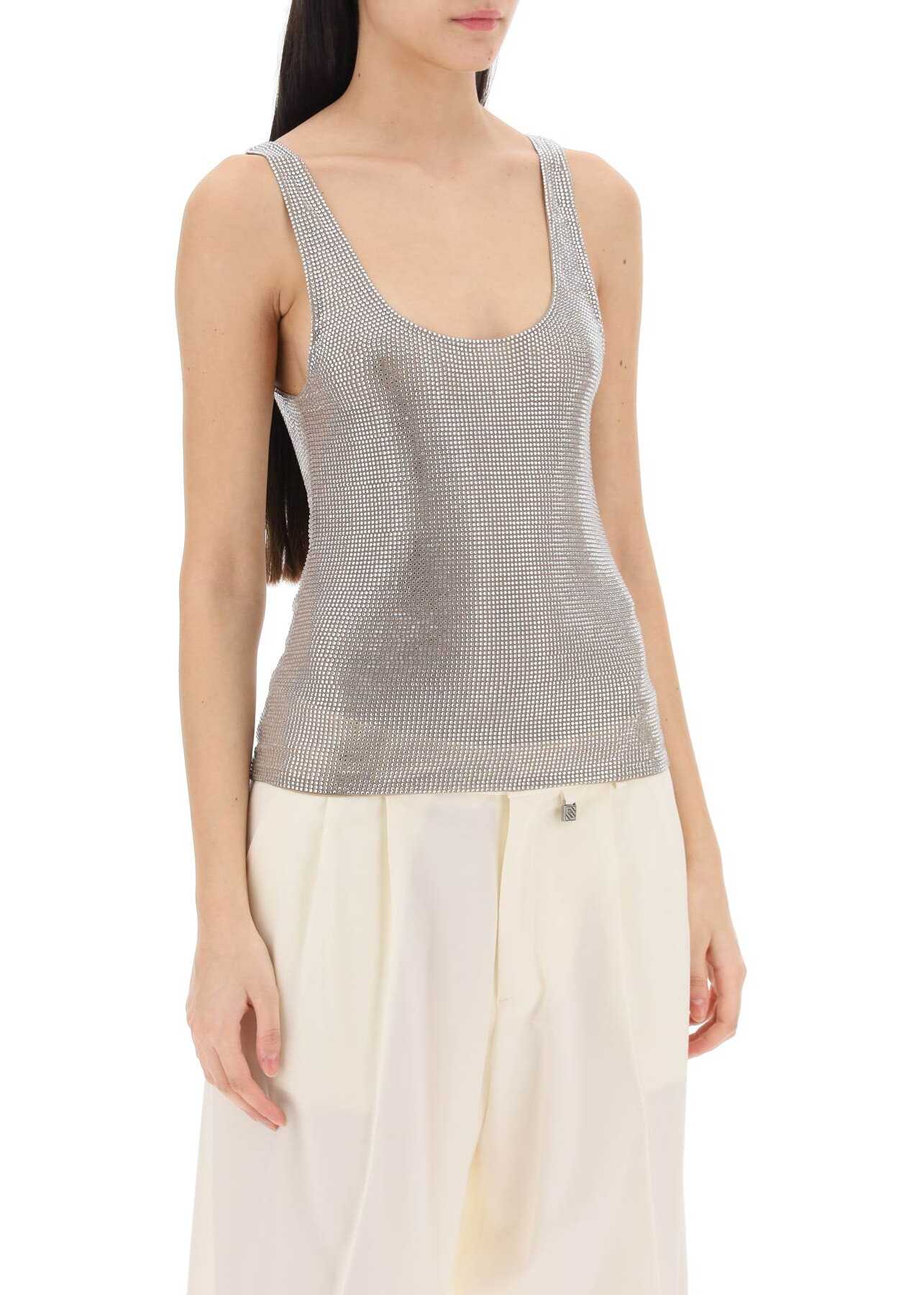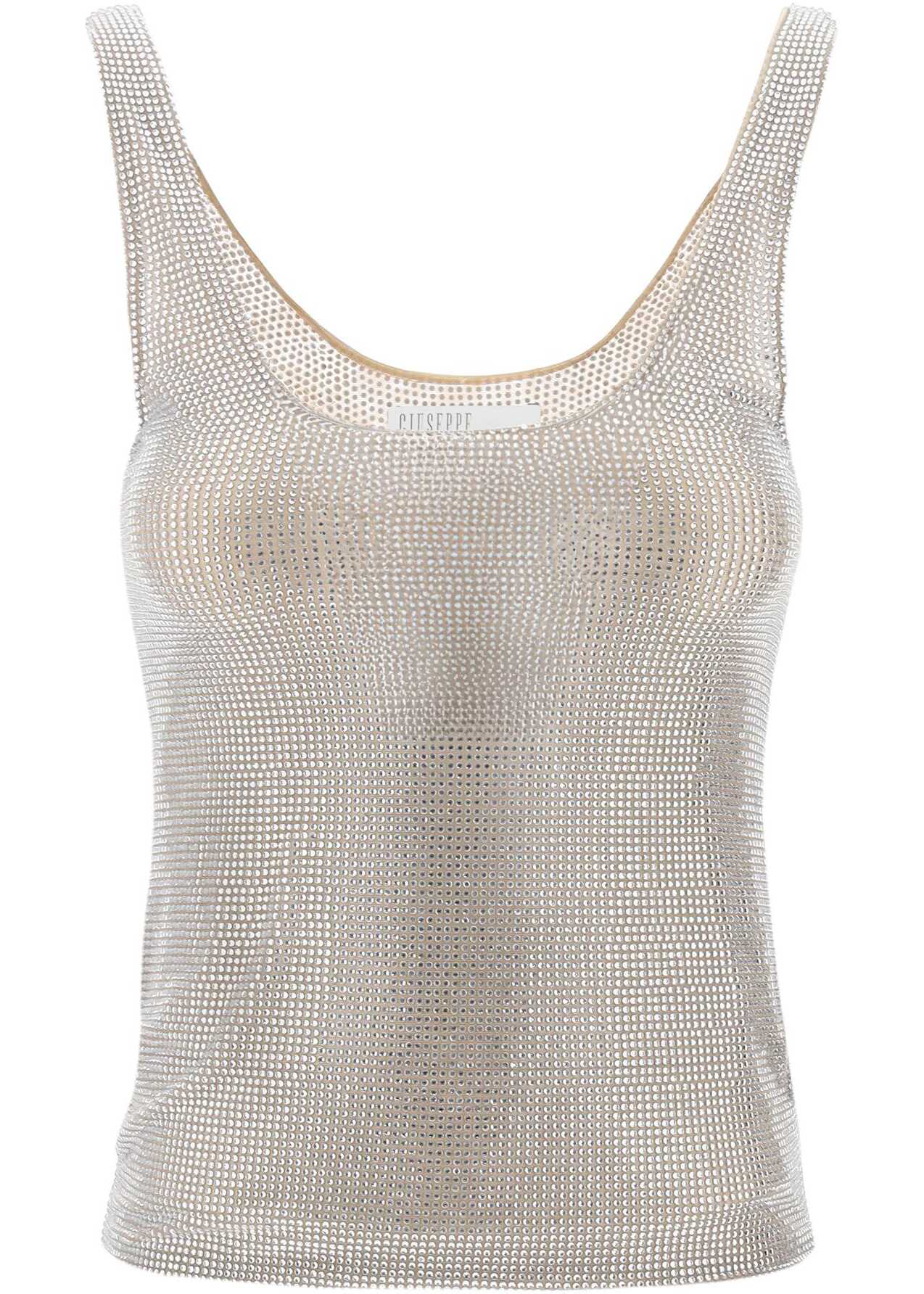 Giuseppe Di Morabito tank top crafted in stretch nylon mesh, fully covered in rhinestone appliques. Provided with wide rounded neckline at front and on the back. Finished with side invisible zip fastening. Regular fit. The model is 177 cm tall and wears a size IT 40.