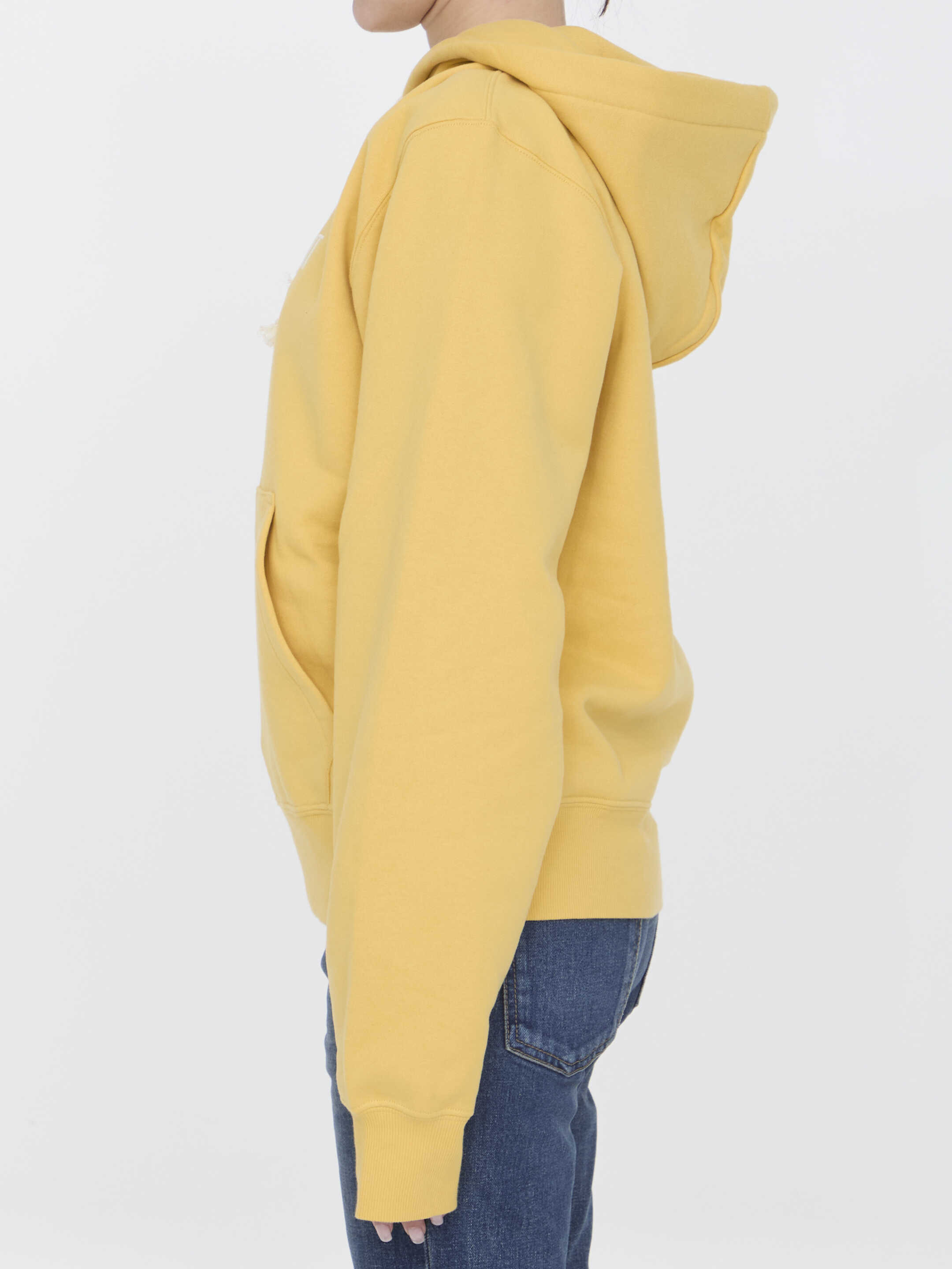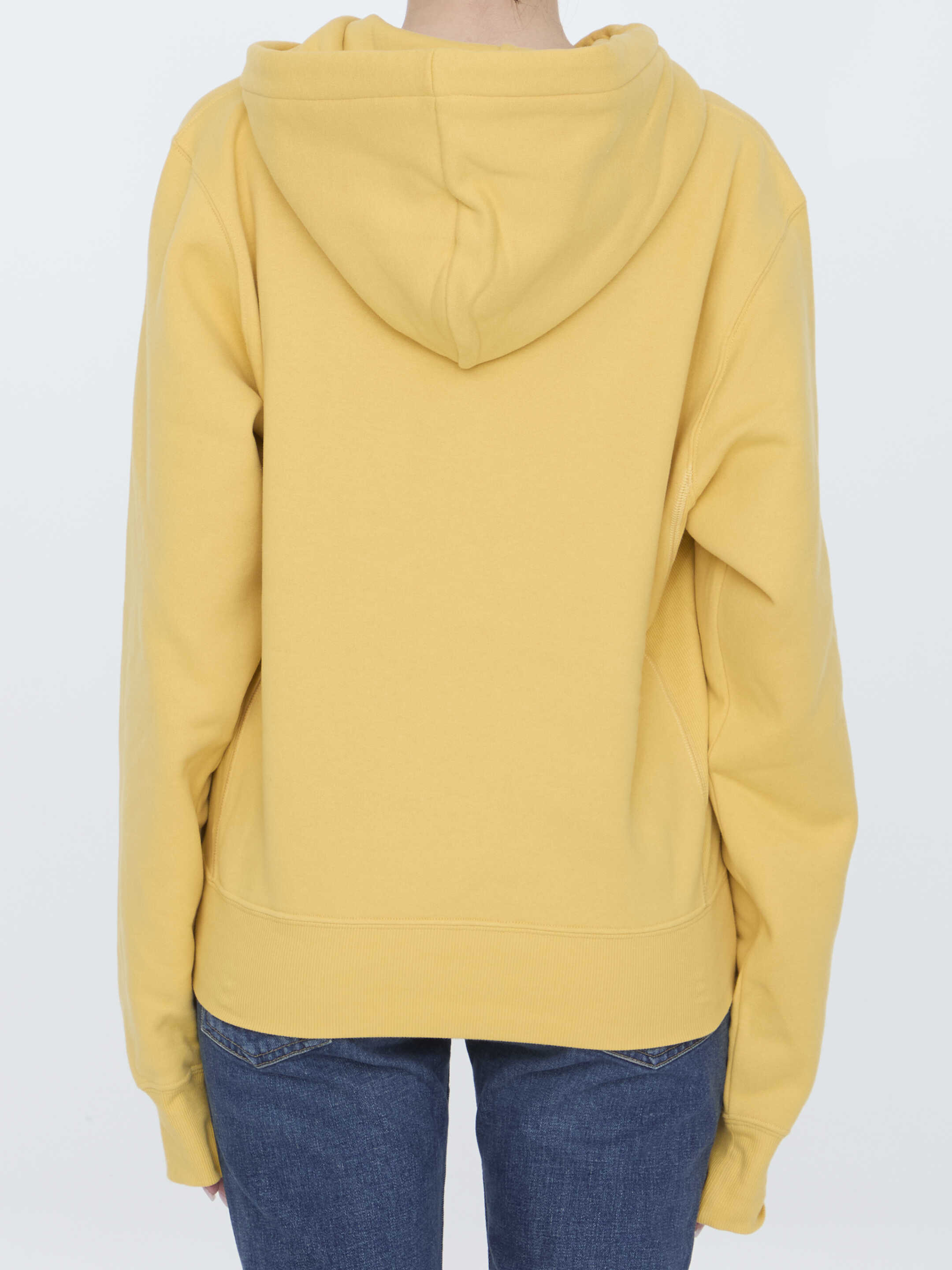 Yellow cotton hoodie with Saint Laurent embroidery on chest. It features drawstring hood, one front kangaroo pocket and ribbed trims on cuffs and hem. Oversized fit.