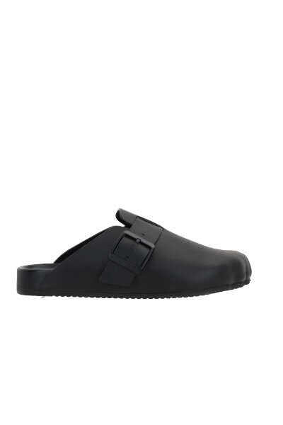Balenciaga's flat mules crafted in black matte leather. Featuring five finger shaped silhouette, adjustable strap with logoed metal buckle, leather lining and rubber sole.